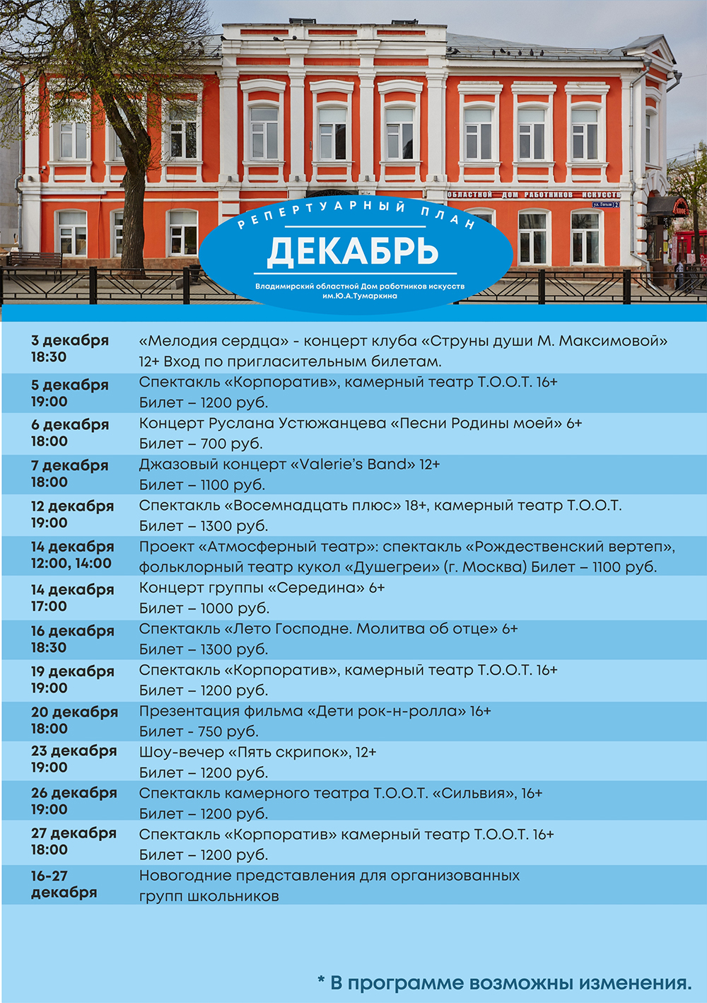 События во ВладимиреВладимирский областной Дом работников искусствРепертуарный план на декабрь 2025Опубликовано: 15 ноября 2025 ![]() Место проведения: Владимирский областной Дом работников искусств Адрес: г. Владимир, ул. Гоголя, 2 Купить билеты можно в кассе ОДРИ по адресу: г. Владимир, ул. Гоголя, 2, остановка "Театральная площадь" Телефон кассы: (4922) 32-21-77, 32-74-45 Онлайн билеты по ссылке: https://vladimirkoncert.ru/shows?place=38 3 декабря в 18:30 «Мелодия сердца» - концерт клуба «Струны души М. Максимовой» 12+ Вход по пригласительным билетам 5 декабря в 19:00 Спектакль «Корпоратив», камерный театр Т.О.О.Т. 16+ Билет - 1200 руб. 6 декабря в 18:00 Концерт Руслана Устюжанцева «Песни Родины моей» 6+ Билет - 700 руб. 7 декабря в 18:00 Джазовый концерт «Valerie's Band» 12+ Билет - 1100 руб. 12 декабря в 19:00 Спектакль «Восемнадцать плюс», камерный театр Т.О.О.Т. 18+ Билет - 1300 руб. 14 декабря в 12:00 и в 14:00 Проект «Атмосферный театр»: «Рождественский вертеп», фольклорный театр кукол «Душегреи» (г. Москва) Билет - 1100 руб. 14 декабря в 17:00 Концерт группы «Середина» 6+ Билет - 1000 руб. 16 декабря в 18:30 Спектакль «Лето Господне. Молитва об отце» 6+ Билет - 1300 руб. 19 декабря в 19:00 Спектакль «Корпоратив», камерный театр Т.О.О.Т. 16+ Билет - 1200 руб. 20 декабря в 18:00 Презентация фильма «Дети рок-н-ролла» 16+ Билет - 750 руб. 23 декабря в 19:00 Шоу-вечер «Пять скрипок» 12+ Билет - 1200 руб. 26 декабря в 19:00 Спектакль камерного театра Т.О.О.Т. «Сильвия» 16+ Билет - 1200 руб. 27 декабря в 18:00 Спектакль «Корпоратив» камерный театр Т.О.О.Т. 16+ Билет - 1200 руб. Информация с https://vk.com/wall-74230818_4158 |
