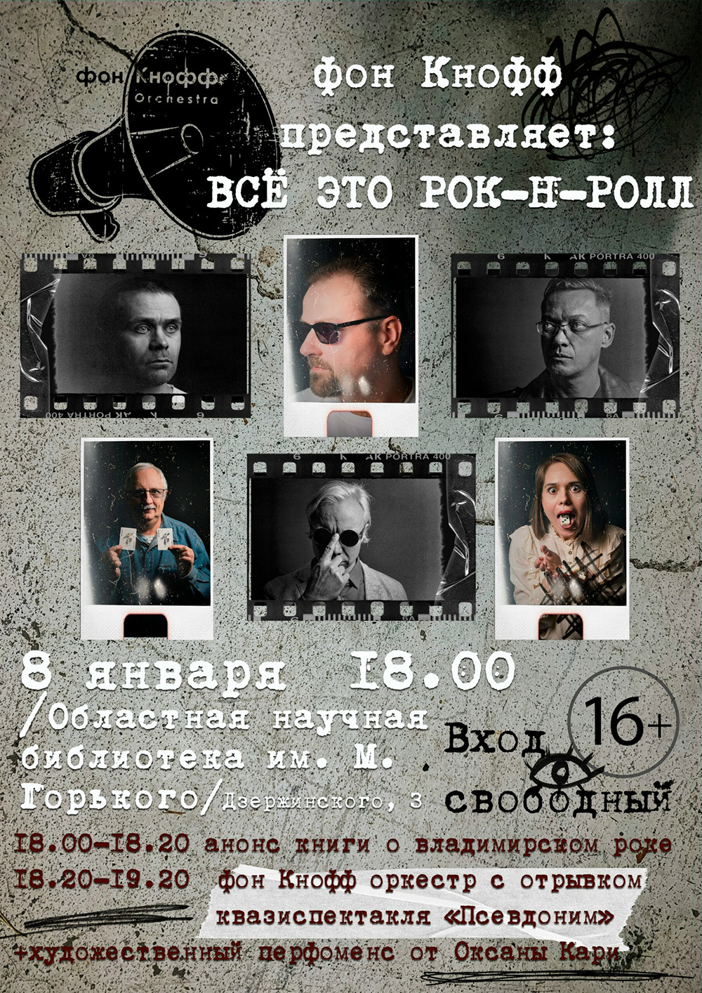 События во ВладимиреВладимирская областная научная библиотекаЛитературно-художественный проект "Всё это рок-н-ролл"Опубликовано: 06 января 2026 ![]() Погружение в историю: Всё это рок-н-ролл! 8 января во Владимирская областная научная библиотека приглашает всех, кому близка культура локальной сцены, на презентацию масштабного литературно-художественного проекта, посвящённого истории владимирского рок-движения. В гостях — культовая группа ФОН КНОФФ orchestra и известные музыканты города. Часть первая: Книга как артефакт Авторы проекта откроют кухню создания первой книги о владимирском роке. Вы узнаете, как рождалась идея и кто станет героями издания, о захватывающем поиске архивных материалов и вдохновении. А также первыми увидите эксклюзивные материалы: портреты для будущей фотовыставки и макет сайта с уникальными фото, видео и аудиозаписями. Часть вторая: Живой звук и перформанс Специальное выступление «фон Кнофф orchestra» — отрывок из квазиспектакля «Псевдоним», где литература и музыка создают единое художественное пространство. Вечер станет уникальным благодаря полуакустическому звучанию, раскрывающему песни по-новому, перформансу художницы Оксаны Кари и иммерсивной фотосессии от Александра Бирюкова. Это больше чем презентация. Это живой срез эпохи. Встретимся скоро! Ждём вас в библиотеке, вход свободный! Дата: 08 января 2026 Начало: в 18.00 Место проведения: Владимирская областная научная библиотека Адрес: г. Владимир, ул. Дзержинского, д. 3 Информация с https://vk.ru/wall-43991890_32361 |
