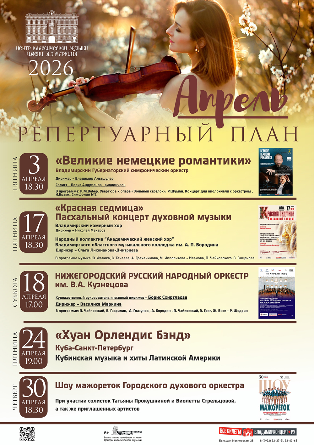 0 04 апреля 2026 в 18:00 0 05 апреля 2026 в 17:00 0 09 апреля 2026 в 18:30 0 11 апреля 2026 в 18:00 0 14 апреля 2026 в 18:30 0 15 апреля 2026 в 18:00 0 15 апреля 2026 в 18:30 0 16 апреля 2026 в 19:00 0 17 апреля 2026 в 18:30 0 19 апреля 2026 в 15:00 Фестиваль «Музыка добра» 0 20 апреля 2026 в 18:30 Фестиваль «Музыка добра» 0 24 апреля 2026 в 19:00 0 24 апреля 2026 в 19:00 0 25 апреля 2026 в 19:00 Торжественное закрытие фестиваля «Музыка добра» 0 26 апреля 2026 в 18:00 0 08 мая 2026 в 10:00 0 10 мая 2026 в 17:00 0 23 мая 2026 в 18:00 0 27 мая 2026 в 18:30 0 28 мая 2026 в 18:30 Прошедшие ранее концерты во Владимире Всего: 58 0 02 апреля 2026 в 18:00 0 02 апреля 2026 в 18:30 Фестиваль «Музыка добра» 0 03 апреля 2026 в 19:00 Камерный театр Т.О.О.Т. 0 04 апреля 2026 в 18:00 0 05 апреля 2026 в 12:00 Абонемент №18, 18А «Сказочное воскресенье», концерт №4 0 05 апреля 2026 в 17:00 Театр Классического балета «Бенефис» 0 05 апреля 2026 в 17:00 0 08 апреля 2026 в 11:30 0 09 апреля 2026 в 18:00 0 11 апреля 2026 в 18:00 0 15 апреля 2026 в 18:00 0 17 апреля 2026 в 19:00 Камерный театр Т.О.О.Т. 0 18 апреля 2026 в 18:00 Камерный театр Т.О.О.Т. 0 24 апреля 2026 в 19:00 Камерный театр Т.О.О.Т. 0 25 апреля 2026 в 12:00 0 26 апреля 2026 в 12:00 0 26 апреля 2026 в 17:00 0 28 апреля 2026 в 18:00 0 28 апреля 2026 в 18:30 0 29 апреля 2026 в 18:00 Прошедшие ранее спектакли во Владимире Всего: 39 0 10 февраля 2026 в 15:00 0 05 марта 2026 в 10:30 0 21 марта 2026 в 10:30 0 24 марта 2026 в 10:00 0 01 апреля 2026 в 09:00 0 02 апреля 2026 в 09:00