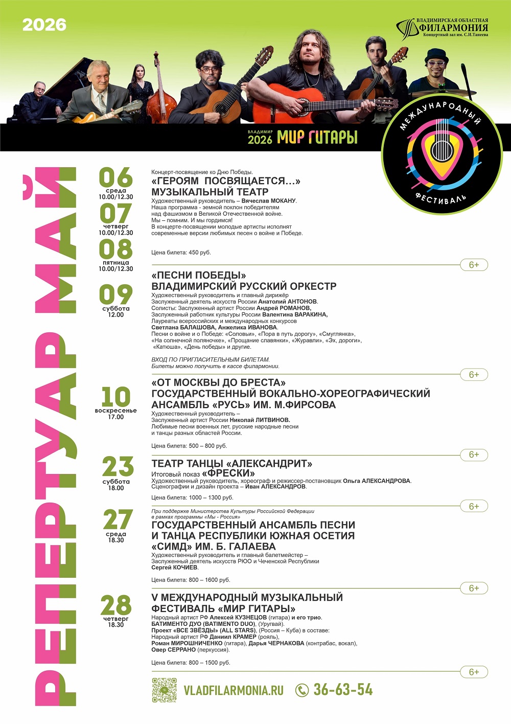 0 26 апреля 2026 в 18:00 0 30 апреля 2026 в 18:30 Образцовый коллектив эстрадного вокала "Джем" и студия танца "Мечтать" 0 05 мая 2026 в 18:30 Фестиваль «Театр и Симфония» 0 07 мая 2026 в 18:30 Фестиваль «Театр и Симфония» 0 08 мая 2026 в 10:00 0 09 мая 2026 в 17:00 Фестиваль «Театр и Симфония» 0 10 мая 2026 в 17:00 0 14 мая 2026 в 18:30 Образцовый ансамбль современного танца "Свободный стиль" 0 17 мая 2026 в 18:00 0 23 мая 2026 в 17:00 Образцовый хореографический коллектив "Седьмой континент" 0 23 мая 2026 в 18:00 0 24 мая 2026 в 18:00 0 24 мая 2026 в 19:00 0 27 мая 2026 в 18:30 0 28 мая 2026 в 18:30 Прошедшие ранее концерты во Владимире Всего: 31 0 26 апреля 2026 в 12:00 0 26 апреля 2026 в 17:00 0 28 апреля 2026 в 18:00 0 28 апреля 2026 в 18:30 0 29 апреля 2026 в 18:00 0 30 апреля 2026 в 18:30 0 06 мая 2026 в 18:30 Фестиваль «Театр и Симфония» 0 07 мая 2026 в 19:00 Камерный театр Т.О.О.Т. 0 13 мая 2026 в 19:00 0 14 мая 2026 в 19:00 0 15 мая 2026 в 18:30 Фестиваль «Театр и Симфония» 0 15 мая 2026 в 19:00 Камерный театр Т.О.О.Т. 0 22 мая 2026 в 19:00 Камерный театр Т.О.О.Т. 0 29 мая 2026 в 19:00 Камерный театр Т.О.О.Т. Прошедшие ранее спектакли во Владимире Всего: 17 0 24 марта 2026 в 10:00 0 01 апреля 2026 в 09:00 0 02 апреля 2026 в 09:00 0 17 апреля 2026 в 10:30 0 20 апреля 2026 в 10:00
