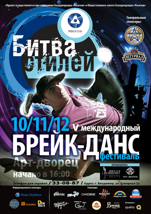 Концерты во ВладимиреМеждународный брейк-данс фестиваль «Битва стилей»10 ноября 2012 в 16:00 ![]() 10 ноября во владимирском Арт-дворце состоится юбилейный Международный брейк-данс фестиваль "Битва стилей". Международный брейк-данс фестиваль «Битва стилей», успевший зарекомендовать себя крупнейшим в среде танцоров и райтеров, теперь будет проходить при поддержке ГК «Росатом». Общественный Совет «Росатома» поддержал совместный проект владимирского Арт-дворца и школы брейк-данса «Доминант», определив его победителем конкурса социально-значимых проектов среди общественных и некоммерческих организаций со всей России. Прошлый фестиваль собрал на площадках Арт-дворца более 3 000 участников и зрителей. Список звездных имен и география участников будущей «Битвы стилей» впечатляет еще больше. Планируется приезд участников из различных регионов России, а также из-за рубежа (Украины, Италии, Норвегии, США и т.д.) Кроме того, организаторы пригласили на фестиваль живую легенду брейк-данс культуры, лицо мирового масштаба – судью из Голландии Tawfig Amrani, принимавшего участие во всемирно известных фестивалях "Red Bull BC one", "The Notorious IBE" и т.д. В среде российской хип-хоп культуры фестиваль давно сделал себе имя: солидный призовой фонд (более 220 тысяч рублей), объективные судьи, высокий уровень организации, а, значит, и комфорта. В этом году «битва» пройдет на четырех площадках Арт-дворца, центральной станет зал площадью более 700 квадратных метров. Зрелищные танцевальные баттлы и комфортные условия для фестиваля - это не единственный козырь организаторов: покажет себя и подрастающее поколение би боев, продемонстрируют свое мастерство на равных со всеми и хрупкие девушки. По словам организатора фестиваля, руководителя школы брейк-данса «Доминант» Александра Родина, в этом году «Битва стилей» обещает быть более напряженной и запоминающейся, а почетные трофеи, как всегда, достанутся тем, кто поразит мастерством, техникой и креативной подачей. « вернуться владимирская афиша другие концерты во Владимире |