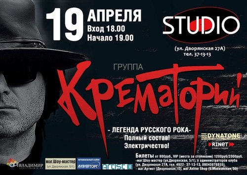Концерты во ВладимиреСольный концерт гр. ″Крематорий″19 апреля 2013 в 19:00 19 апреля 2013 пятница гр.КРЕМАТОРИЙ клуб "STUDIO" ![]() - ЛЕГЕНДА РУССКОГО РОКА- группа "КРЕМАТОРИЙ" Спустя 2 года снова во Владимире!!! Полный состав! Электричество! -БОЛЬШОЙ СОЛЬНЫЙ КОНЦЕРТ- Билеты от 800руб., VIP(места за столиками) 1200руб/2000руб. Всего 46 вип мест за 12 столиками! Кол-во билетов ОГРАНИЧЕНО! -маг.Шоу-мастер (ул.Дворянская, 5/1) -у администраторов клуба "STUDIO" (ул. Дворянская 27А, тел. 4922-37-13-13, 89045978855) -маг.Артист (Дворянская,10) -маг.Anime Shop (Б.Московская, 30) « вернуться владимирская афиша другие концерты во Владимире |