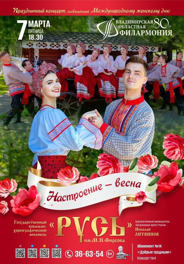 Концерты во Владимире Праздничный концерт «НАСТРОЕНИЕ – ВЕСНА»07 марта 2025 в 18:30 Государственный вокально-хореографический ансамбль «Русь» им. М. Фирсова приглашает мужчин сделать подарок своим возлюбленным, мамам, сестрам и дочерям и прийти вместе с ними на праздничный весенний концерт! Вниманию публики будут представлены лучшие номера коллектива, наполненные дыханием этого прекрасного времени года и, конечно, – любовью к Женщине, преклонением перед ее мудростью и красотой. Приглашаем вас отметить один из самых прекрасных праздников весны в уютной атмосфере нашего концертного зала вместе с ансамблем «Русь»! Исполнители: Государственный вокально-хореографический ансамбль «РУСЬ» им. М.ФИРСОВА Художественный руководитель – заслуженный артист России Николай ЛИТВИНОВ Продолжительность: 1 час 20 минут без антракта Цена билета: 600-800 руб. Действует Пушкинская карта Билеты по ссылке: https://iframeab-pre10088.intickets.ru/seance/47424492/ Дата: 07 марта 2025 Начало: в 18.30 Место проведения: Владимирская областная филармония Адрес: г. Владимир, пр-т Ленина, д. 1 Телефон кассы: 8 (4922) 36-63-54 Информация с http://www.vladfilarmonia.ru/afisha/concerts-in-vladimir/prazdnichnyy-kontsert-nastroenie-vesna/ « вернуться владимирская афиша другие концерты во Владимире |