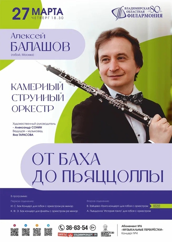Концерты во Владимире Концерт классической музыки «ОТ БАХА ДО ПЬЯЦЦОЛЛЫ»27 марта 2025 в 18:30 Абонемент №6 «Музыкальные перекрёстки», концерт №4 Алексей БАЛАШОВ родился в 1983 году в Москве, окончил Московскую Государственную Консерваторию им. П. И. Чайковского по классу гобоя (проф. А. Уткин). Был солистом ансамбля старинной музыки «Мадригал», Камерного оркестра центра П.Слободкина, Жуковского симфонического» оркестра под управлением С.Скрипки. Участник фестиваля в Узедоме (Германия, 2002). Лауреат двух международных конкурсов: Международного конкурса гобоистов «Казанский Кремль» (I премия, Казань, 2007) и Международного Интернет-конкурса для духовых и ударных инструментов «Ad Libitum» (II премия, 2010). В 2009-2010 гг. был приглашённым артистом в Большом Симфоническом оркестре под управлением В.Федосеева. В настоящее время Алексей Балашов - артист Академического симфонического оркестра МГАФ под управлением Ю. Симонова. В программе: И. С. Бах. Гобойный концерт ре минор И. С. Бах. Произведение для оркестра К. Ф. Э. Бах. Флейтовый концерт ре минор в редакции для гобоя с оркестром В. Зайцева. «Танго-концерт» для гобоя с оркестром А. Пьяццолла. Произведение для оркестра А. Пьяццолла. «История танго» для гобоя с оркестром Исполнитель: КАМЕРНЫЙ СТРУННЫЙ ОРКЕСТР Художественный руководитель – Александр СОНИН Ведущая: музыковед Яна ТАРАСОВА Солист: Алексей БАЛАШОВ (гобой, Москва) Продолжительность концерта: 1,5 часа с антрактом Цена билета: 500 руб. Действует Пушкинская карта Билеты по ссылке: https://iframeab-pre10088.intickets.ru/seance/38110856/ Дата: 27 марта 2025 Начало: в 18.30 Место проведения: Владимирская областная филармония Адрес: г. Владимир, пр-т Ленина, д. 1 Телефон кассы: 8 (4922) 36-63-54 Информация с http://www.vladfilarmonia.ru/afisha/concerts-in-vladimir/kontsert-klassicheskoy-muzyki-ot-bakha-do-pyatstsolly/ « вернуться владимирская афиша другие концерты во Владимире |