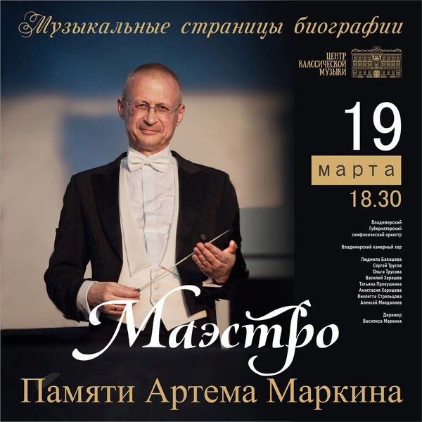 Именно в этот день год назад, 19 марта ушел от нас наш Маэстро - создатель Владимирского Губернаторского симфонического оркестра, его бессменный художественный руководитель и дирижер, директор Центра классической музыки, Заслуженный артист Российской Федерации Артем Эдуардович Маркин.