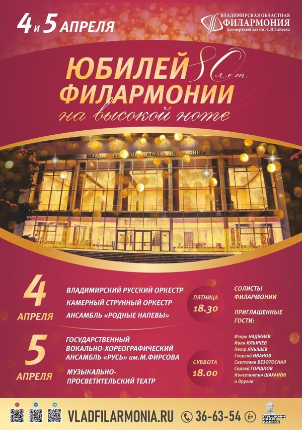 Концерты во Владимире Торжественный гала-концерт «ЮБИЛЕЙ НА ВЫСОКОЙ НОТЕ»04 апреля 2025 в 18:30 День первый К 80-летию Владимирской областной филармонии Да, искусство и музыка имеют крепкую связь. Филармония - это место, где люди могут наслаждаться выступлениями великих музыкантов, оркестров и солистов. Это место, где искусство оживает через звуки и выражение чувств, создавая неповторимый опыт для слушателей. В этот вечер зрители увидят выступления творческих коллективов филармонии и гостей праздника. ВЛАДИМИРСКИЙ РУССКИЙ ОРКЕСТР Художественный руководитель и главный дирижёр - заслуженный деятель искусств России Анатолий АНТОНОВ КАМЕРНЫЙ СТРУННЫЙ ОРКЕСТР Художественный руководитель – Александр СОНИН Ансамбль «РОДНЫЕ НАПЕВЫ» В концерте принимают участие: Певец, поэт, композитор, актёр Игорь НАДЖИЕВ (Москва) Солист театра «РОМЭН» Пётр ЯНЫШЕВ (Москва) Георгий ИВАНОВ (гитара, вокал) Анжелика ИВАНОВА Светлана БЕЗОТОСНАЯ (скрипка, Москва) Заслуженный артист России Андрей РОМАНОВ заслуженная артистка России Елена МОЛОДЦОВА заслуженный работник культуры России Валентина ВАРАКИНА лауреат Всероссийских конкурсов Владимир САВУШКИН Ведущие концерта: Певец, руководитель проекта «Имена на все времена» Иван ИЛЬИЧЁВ (Москва), телеведущая Мария ПЛАТАНЮК Продолжительность: 2 часа с антрактом Цена билета: 600, 800, 1 000 руб. Действует Пушкинская карта Дата: 04 апреля 2025 Начало: в 18.30 Место проведения: Владимирская областная филармония Адрес: г. Владимир, пр-т Ленина, д. 1 Телефон кассы: 8 (4922) 36-63-54 Информация с http://www.vladfilarmonia.ru/afisha/concerts-in-vladimir/torzhestvennyy-gala-kontsert-yubiley-na-vysokoy-note/ « вернуться владимирская афиша другие концерты во Владимире |