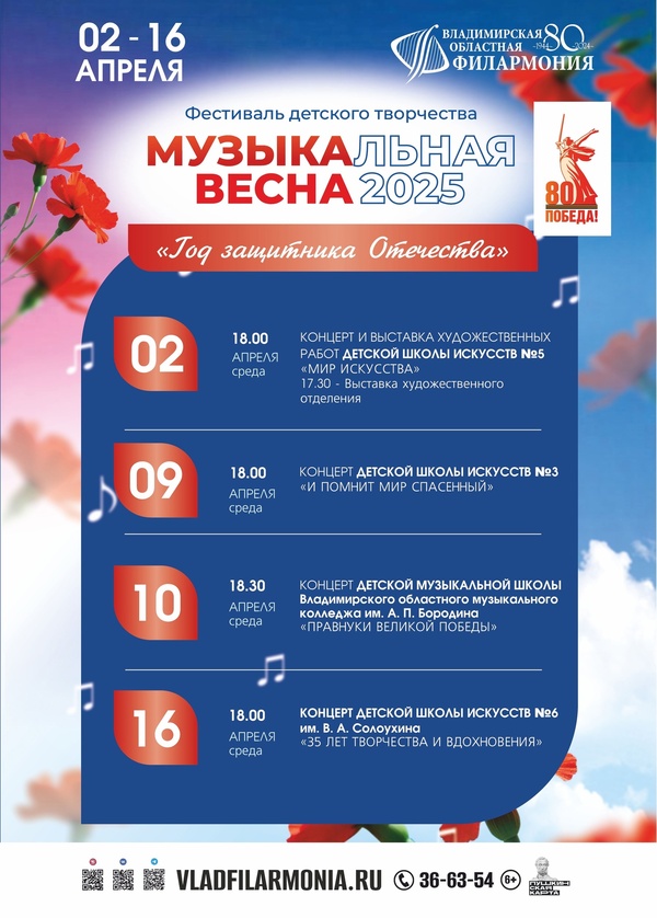 Концерты во Владимире Концерт ДШИ №3 г.Владимира «И ПОМНИТ МИР СПАСЁННЫЙ»09 апреля 2025 в 18:00 «Год защитника Отечества» Фестиваль детского творчества «Музыкальная весна 2025» Концерт Детской школы искусств №3 г. Владимира «И ПОМНИТ МИР СПАСЁННЫЙ» Ежегодно в апреле учащиеся детских школ искусств представляют на суд жителей города Владимира результаты года своих усердных репетиций. Одной из важнейших задач является поддержка деятельности педагогов учебных заведений сферы культуры и популяризация результатов творческих достижений их воспитанников. На концертах фестиваля зрителей ждут сольные и ансамблевые номера учащихся и педагогов детских школ искусств, исполненные на клавишных, струнных, духовых, ударных, народных инструментах, выступления детских оркестров, а также работы воспитанников театральных и художественных классов. Продолжительность концерта: 1 час 30 минут без антракта Цена билета: 200 руб. Билеты по ссылке: https://vladimirkoncert.ru/shows/event/8848-Kontsert-DSHI-3-g-Vladimira-I-POMNIT-MIR-SPASENNYI Дата: 09 апреля 2025 Начало: в 18.00 Место проведения: Владимирская областная филармония Адрес: г. Владимир, проспект Ленина, дом 1 Информация с http://www.vladfilarmonia.ru/afisha/concerts-in-vladimir/kontsert-detskoy-shkoly-iskusstv-3-g-vladimira-moya-semya-moye-bogatstvo/ « вернуться владимирская афиша другие концерты во Владимире |