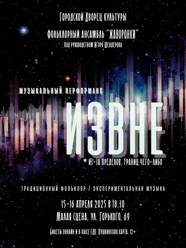 Концерты во Владимире Презентация фолк-проекта ансамбля «Жаворонки»15 апреля 2025 в 18:30 Немного мистики, много живой музыки и чуть-чуть космического звучания "странных" инструментов. Фольклорный ансамбль "Жаворонки" представляет свой новый проект - фолк-перформанс "ИЗВНЕ". Как поясняют словари, ИЗВНЕ - "со стороны, из-за пределов, границ чего-либо"... Из чего сотканы эмоции? Почему чаще они ВНЕ нашего контроля? ИЗ каких глубин души рождается музыка? Может ли она существовать ВНЕ времени и определённого пространства? Из-за каких пределов, из-за границ чего , к нам приходят ощущения, чувства, желания? ИЗВНЕ... Цена билета: 250 руб. Билеты в кассе ГДК (ул. Горького, 54) и онлайн по ссылке: https://quicktickets.ru/vladimir-dk/e161 Дата: 15 и 16 апреля 2025 Начало: в 18.30 Место проведения: Малая сцена ГДК Адрес: г. Владимир, ул. Горького, 69 Информация сhttps://vk.com/wall-42084592_13803 « вернуться владимирская афиша другие концерты во Владимире |