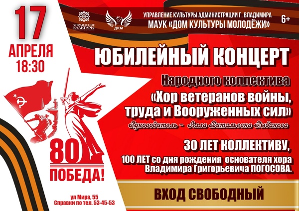 МАУК «Дом культуры молодёжи» приглашает 17 апреля в 18:30 на ЮБИЛЕЙНЫЙ КОНЦЕРТ Народного коллектива Хор ветеранов войны, труда и Вооружённых сил им. В. Г. Погосова».