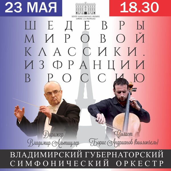 Концерты во Владимире «Шедевры мировой классики. Из Франции в Россию»23 мая 2025 в 18:30 Музыкальный мостик из Франции в Россию от Владимирского Губернаторского симфонического оркестра В программе концерта прелюдия к «Послеполуденному отдыху фавна» Клода Дебюсси, «Кармен-сюита» Жоржа Бизе и Родиона Щедрина в исполнении струнного состава оркестра и группы ударных инструментов ВГСО, а также Концерт для виолончели с оркестром Камиля Сен-Санса в исполнении виолончелиста, педагога, доцента Московской консерватории, заслуженного артиста России Бориса Андрианова За дирижерским пультом - Владимир Альтшулер Дата: 25 мая 2025 года Начало: в 18:30 Место: Центр классической музыки Билеты в кассе Центра классической музыки по адресу: ул. Большая Московская, 28 Ежедневно с 10:00 до 19:00 (14:00-15:00 перерыв на обед) ПРОГРАММА ДОСТУПНА К ПОСЕЩЕНИЮ ПО ПУШКИНСКОЙ КАРТЕ Билеты по ссылке: https://vk.cc/cLbs6i Телефоны для справок: 8 (4922) 32-27-71; 32-63-65 Информация с https://www.vgso.ru/?menu=concert&number=1033 « вернуться владимирская афиша другие концерты во Владимире |