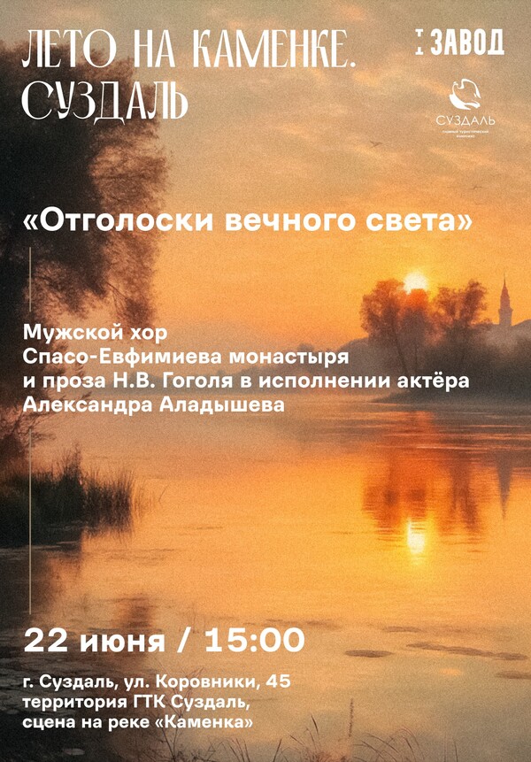 Концерты во Владимире Концерт «Отголоски вечного света»22 июня 2025 в 15:00 Проект «Лето на Каменке. Суздаль» Мужской хор Спасо-Евфимиева монастыря и проза Н.В. Гоголя в исполнении актера Александра Аладышева. Цена билета: 900-2000 руб. Билеты по ссылке: https://iframeab-pre10267.intickets.ru/event/58065458 Дата: 22 июня 2025 Начало: в 15.00 Место проведения: территория ГТК Суздаль, сцена на реке «Каменка» Адрес: г. Суздаль, ул. Коровники, 45 Информация с https://vk.com/ttzavod « вернуться владимирская афиша другие концерты во Владимире |