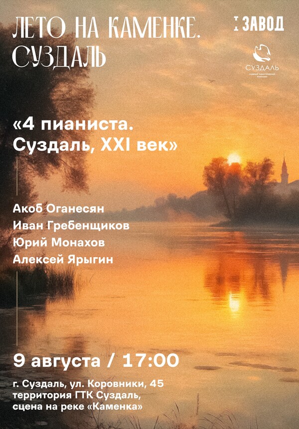 Концерты во Владимире Концерт «4 пианиста. Суздаль, XXI век»09 августа 2025 в 17:00 Проект «Лето на Каменке. Суздаль» Акоб Оганесян, Ялексей Ярыгин,Юрий монахов, Иван Гребенщиков. Цена билета: 900-2000 руб. Билеты по ссылке: https://iframeab-pre10267.intickets.ru/event/58066806 Дата: 09 августа 2025 Начало: в 17.00 Место проведения: территория ГТК Суздаль, сцена на реке «Каменка» Адрес: г. Суздаль, ул. Коровники, 45 Информация с https://vk.com/ttzavod « вернуться владимирская афиша другие концерты во Владимире |