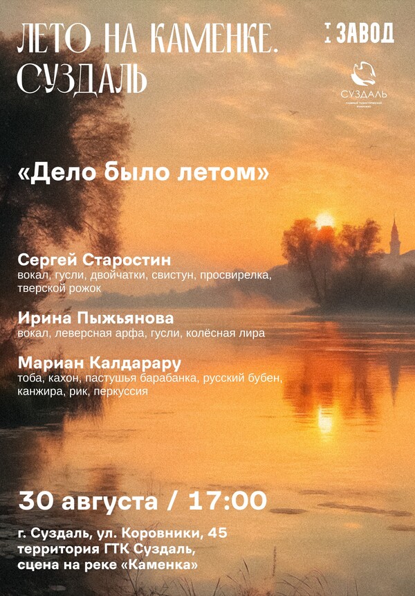 Концерты во Владимире Концерт «Дело было летом»30 августа 2025 в 17:00 Проект «Лето на Каменке. Суздаль» Сергей Старостин — вокал, гусли, двойчатки, свистун, просвирелка, тверской рожок. Ирина Пыжьянова — вокал, гусли, колёсная лира. Мариан Калдарару — тоба, кахон, пастушья барабанка, русский бубен, канжира, рик, перкуссия. Цена билета: 900-2000 руб. Билеты по ссылке: https://iframeab-pre10267.intickets.ru/event/58066964 Дата: 30 августа 2025 Начало: в 17.00 Место проведения: территория ГТК Суздаль, сцена на реке «Каменка» Адрес: г. Суздаль, ул. Коровники, 45 Информация с https://vk.com/ttzavod « вернуться владимирская афиша другие концерты во Владимире |