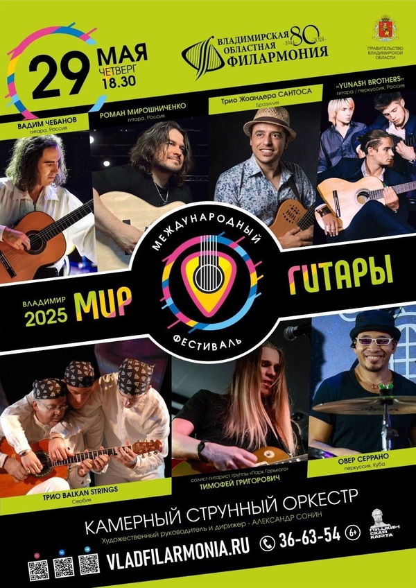 Концерты во Владимире IV Международный музыкальный фестиваль «Мир гитары»29 мая 2025 в 18:30 Владимирская областная филармония с гордостью представляет музыкальное событие, которое вновь соберёт выдающихся музыкантов из разных стран. Программа фестиваля будет интересна как искушенному ценителю гитары, так и рядовому слушателю, который впервые откроет для себя поистине бескрайнюю палитру звучания старинного инструмента. Интернациональный гитарный форум проводится во Владимире в 4-й раз и продолжит традицию дарить владимирцам незабываемые концерты и наслаждение игрой настоящих мастеров самых различных жанров и направлений гитарной музыки! Фестиваль «Мир гитары - 2025» во Владимире это: - Трио Жоандера САНТОСА (Бразилия) - Победитель ежегодного конкурса инструментальной музыки «Мой Северо-Восток - 2023», группа «YUNASH BROTHERS» (г. Москва) - Лауреат Global Music Awards Вадим ЧЕБАНОВ (Россия) с программой «АРАНХУЭС» - Трио BALKAN STRINGS (Сербия) - КАМЕРНЫЙ СТРУННЫЙ ОРКЕСТР, художественный руководитель – Александр СОНИН Проект Романа МИРОШНИЧЕНКО «Fusion Holiday» в составе: - Валерий Черноок (ударные) - Владимир Нестеренко (клавишные) - Александр Болдырев (бас-гитара) - Дмитрий Ланской (вокал) - Овер Серрано (перкуссия, Куба) Специальный гость: солист-гитарист группы «Парк Горького» Тимофей ГРИГОРОВИЧ Продолжительность: 2 часа с антрактом Цена билета: 800 - 1500 руб. Билеты по ссылке: https://iframeab-pre10088.intickets.ru/seance/51905919/ Дата: 29 мая 2025 Начало: в 18.30 Место проведения: Владимирская областная филармония Адрес: г. Владимир, пр-т Ленина, д. 1 Телефон кассы: 8 (4922) 36-63-54 Информация с http://www.vladfilarmonia.ru/afisha/concerts-in-vladimir/iv-mezhdunarodnyy-muzykalnyy-festival-mir-gitary/ « вернуться владимирская афиша другие концерты во Владимире |