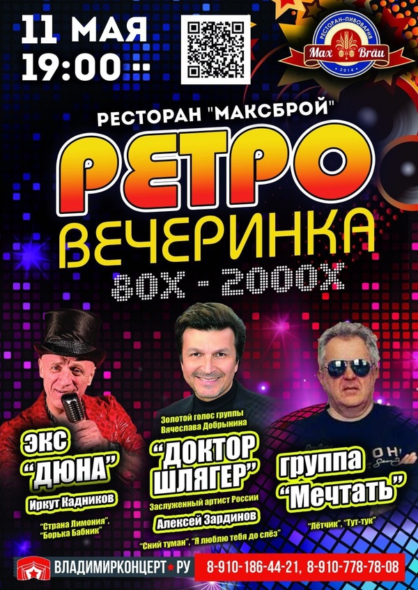 Концерты во Владимире Ретро вечеринка 80x-2000x11 мая 2025 в 19:00 Вас ждёт крутое шоу! Супер-дискотека РЕТРО ВЕЧЕРИНКА 80x-2000x. Любимые песни, любимые мелодии, любимые артисты! 2 часа отличного настроения под супер хиты: Группа Мечтать - российская рок-группа. В 1996 году группа взорвала музыкальный хит парад песней "Лётчик". Хиты: "Тук-тук", " Вижу сны", "Если только", "Февраль".ЭксДЮНА Иркут Кадников Хиты: "Привет с большого будуна", "Страна лимония", "Мечта", "Коммунальная квартира", "Вдруг, как в сказке". Золотой голос группы Вячеслава Добрынина "Доктор Шлягер" Заслуженный артист России Алексей Зардинов. Хиты: "Синий туман", "Я люблю тебя до слез", "Бабушки-старушки", "Так вот какая ты!", "Льётся музыка" Событие, которое нельзя пропустить! Билеты по ссылке: https://vk.cc/cLxzJF Дата: 11 мая 2025 Начало: в 19.00 Место: ресторан Макс Брой Адрес: г. Владимир. ул. Дзержинского, д. 11, 2 этажИнформация с https://vk.com/wall-77563659_19236 « вернуться владимирская афиша другие концерты во Владимире |