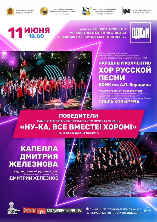 Концерты во Владимире Победители "Ну-ка, все вместе! Хором!"11 июня 2025 в 18:00 Грандиозная новость! В рамках II Международного молодежного баттл-фестиваля «Владимирские музыкальные сезоны» впервые выступят сразу два победителя хорового сезона самого масштабного вокального шоу страны «Ну-ка, все вместе! Хором!» на телеканале «Россия-1». А это - покоривший исполнительской филигранностью и эмоциональной проникновенностью многомиллионную аудиторию телезрителей и именитых экспертов Хор русской песни Владимирского областного музыкального колледжа им. А.П. Бородина (г. Владимир) и поразившая своей, совсем не детской, мощью и юношеским напором Капелла Дмитрия Железнова (г. Казань). Владимирский Хор русской песни, исполнив в отборочном туре историческую народную песню «Ох, ни за речкою», получил 100 баллов из 100. Владимирцы стали единственными, кому удалось достигнуть такого результата в первом выпуске. Душевное исполнение тронуло всех, а многих даже до слез. В финале авторское произведение Дмитрия Катрича «Что за месяц» в исполнении Хора произвело на судей неизгладимое впечатление. Как результат — вновь максимальная оценка! Сценическое воплощение плясовой песни "Во горенке, во новой" в современном прочтении было потрясающим. В итоге, ВПЕРВЫЕ в истории шоу ДВА победителя. 11 июня в 18.00 два блистательных хоровых коллектива коллектива - на сцене Областного дворца культуры и искусства! Не пропустите! Цена билета: 700-1000 руб. Билеты по ссылке: https://vk.cc/cM4GhF Дата: 11 июня 2025 Начало: в 18.00 Место проведения: Областной Дворец культуры и искусства Адрес: г. Владимир, ул. Диктора Левитана, д. 4 Информация с https://vk.com/wall-3699295_10162 « вернуться владимирская афиша другие концерты во Владимире |