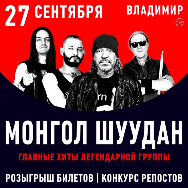 Концерты во Владимире Группа "Монгол Шуудан"27 сентября 2025 в 20:00 Легендарный «Монгол Шуудан выступит во Владимире! Концерт группы «Монгол Шуудан» во Владимире состоится 27 сентября! Вас ждут бессмертные хиты, неповторимая атмосфера анархии, мощный живой звук и крутой драйв! В программе — только лучшие песни, которые весь зал обязательно будет подпевать в едином порыве. Концерт в концертном баре «Цех» соберет всех по-боевому настроенных единомышленников группы, готовых к феерическому угару под нетленные хиты «МШ». Билеты онлайн без наценок и сборов: https://vk.cc/cL1Pya Билеты также в продаже во всех кассах города и на Яндекс Афише: https://afisha.yandex.ru/vladimir/concert/mongol-shuudan-tour Дата: 27 сентября 2025 Сбор гостей: в 19.00 Начало: в 20.00 Место: Концертный бар "ЦЕХ" (ВЗПО Техника, бывший клуб «STUDIO») Адрес: г. Владимир, ул. Дворянская, 27А, корп. 2 Информация с https://vk.com/mongolshuudan_vladimir2025 « вернуться владимирская афиша другие концерты во Владимире |