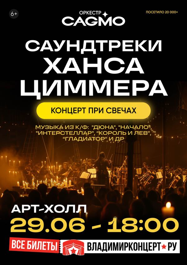 Концерты во Владимире Оркестр CAGMO. "Саундтреки Ханса Циммера при свечах"29 июня 2025 в 18:00 С уникальным творчеством Ханса Циммера знаком каждый. Совместная работа с великими режиссерами, такими как Кристофер Нолан, Ридли Скотт, Гай Ричи и многими другими, позволила композитору создать музыкальные киномиры, покорившие как поклонников кинематографа, так и любителей отличной музыки. В исполнении струнного оркестра CAGMO прозвучат лучшие саундтреки композитора. Оригинальное звучание композиций, подчеркивающее авторский стиль Ханса Циммера, передаст атмосферу любимых фильмов. Новое прочтение легендарной музыки позволит заново прочувствовать впечатления и эмоции от просмотра эпических кинокартин. Концертная программа «Саундтреки Ханса Циммера при свечах» объединила в себе захватывающие мелодии из популярных анимационных фильмов и культовых кинокартин, таких как: «Интерстеллар», «Дюна», «Король Лев», «Пираты Карибского моря», «Кунг-фу Панда», «Начало», «Код да Винчи: Ангелы и Демоны», «Звонок», «Шерлок Холмс», «Гладиатор». Цена билета: 2500-5600 руб. Билеты по ссылке: https://vk.cc/cMtuFR Дата: 29 июня 2025 Начало: в 18.00 Место: Art Hall Адрес: г. Владимир, ул. Северная, 2А Информация с https://arthall.org/events/kontserty/orkestr-cagmo-saundtreki-khansa-tsimmera-pri-svechakh-art-kholl-g-vladimir « вернуться владимирская афиша другие концерты во Владимире |
