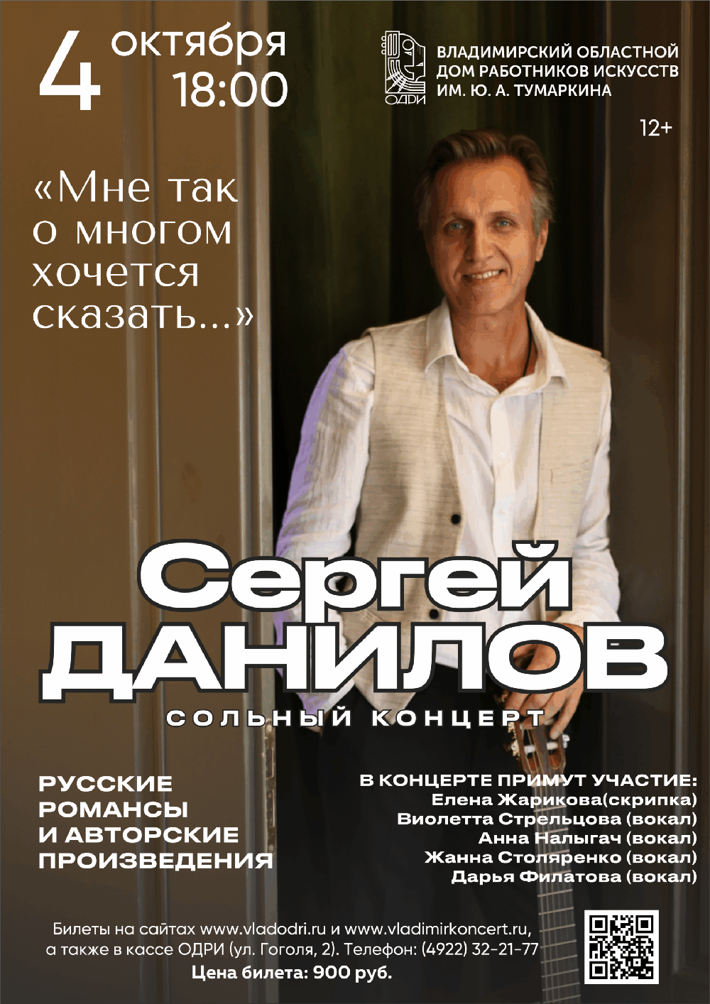 Концерты во Владимире Сольный концерт Сергея Данилова04 октября 2025 в 18:00 4 октября в ОДРИ состоится сольный концерт Сергея Данилова. В новой программе — любимые русские романсы, а также песенная лирика — авторские композиции. Сергей Данилов — владимирский певец, участник проектов Владимирского областного дома работников искусств им.Ю.А.Тумаркина Участник первого фестиваля русского и цыганского романса (г. Владимир, 1995г.) Обладатель Гран-при конкурса «Шлягер-96» (г. Владимир) Победитель всероссийского фестиваля-конкурса «Милосердие белых ночей» (г. Санкт-Петербург в 2014, 2019 и 2023 г.) Лауреат 1 премии всероссийского фестиваля-конкурса «Щит и Лира» (г. Москва, 2010г.) С 1998 по 2025 год — солист оркестра УМВД России по Владимирской области. Цена билета: 900 рублей Купить билеты можно в кассе ОДРИ по адресу: г. Владимир, ул. Гоголя, 2, остановка "Театральная площадь" Телефон кассы: (4922) 32-21-77, 32-74-45 Онлайн билеты по ссылке: https://vladimirkoncert.ru/shows/event/9788-Solnyi-kontsert-Sergeya-Danilova Дата: 04 октября 2025 Начало: в 18.00 Место проведения: Владимирский областной Дом работников искусств Адрес: г. Владимир, ул. Гоголя, 2 Информация с https://vladodri.ru/events/solnyj-koncert-sergeja-danilova-2/ « вернуться владимирская афиша другие концерты во Владимире |