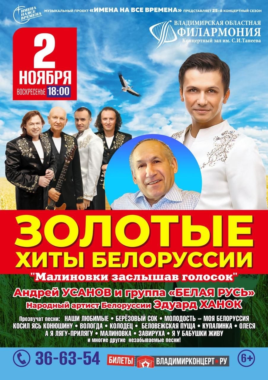 Концерты во Владимире Группа «Белая Русь» с программой «Золотые хиты Белоруссии»02 ноября 2025 в 18:00 Эти незабываемые хиты знает каждый – «Малиновки заслышав голосок», «Беловежская пуща», «За полчаса до весны», «Вологда», «Молодость моя – Белоруссия», «Колодец», «Завируха», «Александрина», «Мой родный кут», «Косил Ясь конюшину», «Бывайте здоровы», «Купалинка»… 2 ноября 2025 в 18.00 во Владимирской филармонии – праздничный концерт в честь Дня народного единства. Это будет настоящий праздник песни, потрясающий фейерверк хитов, которым хочется подпевать! В программе «Золотые хиты Белоруссии» прозвучат песни, рожденные на прекрасной белорусской земле, написанные легендарными авторами и знакомые нам по первым же звукам с детства! Программа с успехом не первый год проходит в Москве, Санкт-Петербурге и других городах. Во Владимире – премьера! Эту программу владимирцам подарят великолепные белорусские музыканты – группа «БЕЛАЯ РУСЬ» и ее солист Андрей УСАНОВ, а также легендарный композитор Эдуард ХАНОК. Андрей Усанов – солист и создатель группы «Белая Русь». С 2008 года он был главным солистом Белорусского государственного ансамбля «Песняры». С «Песнярами» артист объездил всю Беларусь и многие города России, в том числе многократно в составе легендарного ансамбля выступал на торжественных концертах в БКЗ «Октябрьский». В его творческом багаже - дуэт с Юлией Началовой. Его голос зрители называют «золотым голосом Беларуси». Группу «Белая Русь» по праву можно назвать продолжателями песенных традиций легендарного ансамбля «Песняры». Коллектив отличает фирменное «белорусское» звучание, авторские аранжировки, элегантное сочетание фолка и современной музыки. В концерте примет участие легенда белорусской песни, композитор, народный артист Белоруссии – Эдуард Ханок. Перу композитора принадлежат такие хиты как: «То ли еще будет», «Малиновка», «Потолок ледяной», «Я у бабушки живу», «Лягу-прилягу» и мн.др. Праздничный концерт «Золотые хиты Белоруссии. Малиновки заслышав голосок» обещает стать прекрасным подарком всем, кто любит добрые прекрасные белорусские песни и хиты белорусской эстрады, кто любит подпевать душевным песням и душевному исполнению! Продолжительность концерта: 2 часа с антрактом Цена билета: 1100-2100 руб. Билеты на концерт можно приобрести в кассе филармонии и онлайн по ссылке: https://vk.cc/cQGpfI Дата: 02 ноября 2025 Начало: в 18.00 Место проведения: Владимирская областная филармония Адрес: г. Владимир, проспект Ленина, дом 1 Информация с http://www.vladfilarmonia.ru/afisha/concerts-in-vladimir/zolotye-khity-belorussii-v-programme-malinovki-zaslyshav-golosok/ « вернуться владимирская афиша другие концерты во Владимире |