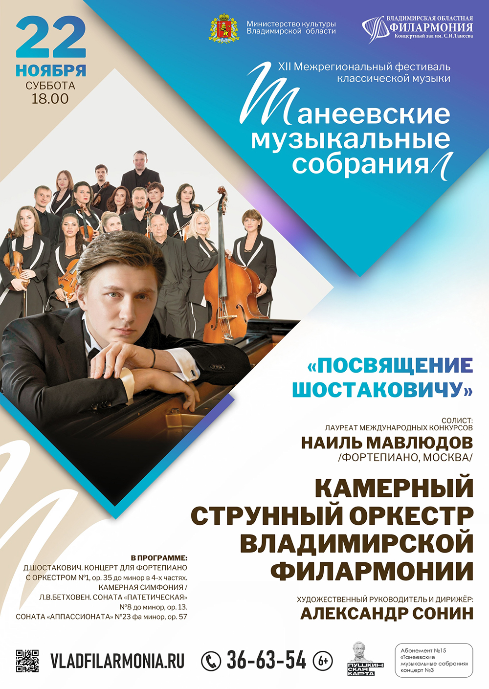 Концерты во Владимире Концертная программа «ПОСВЯЩЕНИЕ ШОСТАКОВИЧУ»22 ноября 2025 в 18:00 Фестиваль «Танеевские музыкальные собрания» Наиль Мавлюдов родился в 1992 году в Саратове. Он выпускник Московской государственной консерватории им. П. И. Чайковского, класс народного артиста РСФСР, профессора Сергея Леонидовича Доренского, где в 2019 году окончил ассистентуру-стажировку в классе того же профессора, выпускник курса Postgraduate в Университете Mozarteum в классе профессора Жака Рувье (Зальцбург, Австрия), амбассадор проекта «Русская фортепианная школа». Наиль – лауреат престижных международных конкурсов. Он неоднократно выступал с концертами в США, Японии, Китае, Австрии, Германии, Италии, Швейцарии, Франции, и др.. Был участником фестивалей: «Кремль музыкальный» памяти Н. Петрова в Оружейной палате Московского Кремля, XIV Международный музыкальный фестиваль «Вселенная звука» и др. Художественный руководитель и главный дирижёр Камерного струнного оркестра – Александр СОНИН. Программа концерта: Д. Шостакович: Концерт для фортепиано с оркестром №1, ор.35 до минор в 4-х частях. Камерная симфония. Л.В. Бетховен: соната «Патетическая» №8, до минор, ор.13, соната «Аппассионата» №23, фа минор, ор.57. Продолжительность: 1,5 часа с антрактом Действующие лица и исполнители: Камерный струнный оркестр Владимирской филармонии Лауреат международных конкурсов Наиль МАВЛЮДОВ (фортепиано, г. Москва) Цена билета: 600-1000 руб. Доступно приобретение билетов по Пушкинской карте Билеты на концерт можно приобрести в кассе филармонии и онлайн по ссылке: https://iframeab-pre10088.intickets.ru/seance/65815475 Дата: 22 ноября 2025 Начало: в 18.30 Место проведения: Владимирская областная филармония Адрес: г. Владимир, проспект Ленина, дом 1 Информация с http://www.vladfilarmonia.ru/afisha/concerts-in-vladimir/kontsertnaya-programma-posvyashchenie-shostakovichu/ « вернуться владимирская афиша другие концерты во Владимире |