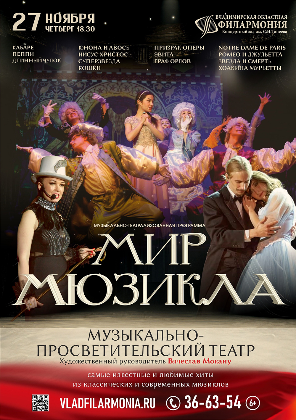 Концерты во Владимире Концертная программа «МИР МЮЗИКЛА»27 ноября 2025 в 18:30 Музыкально-просветительский театр представляет новую концертную программу "МИР МЮЗИКЛА", в которой вас ждут самые известные и любимые хиты из классических и современных мюзиклов, которые завоевали сердца миллионов по всему миру. Это уникальный шанс услышать вживую популярные композиции, ставшие настоящими хитами, и почувствовать магию театра и музыки! Погрузитесь в яркий, волшебный мир музыкальных историй, который никого не оставит равнодушным! Программа «МИР МЮЗИКЛА» - настоящее путешествие в мир эмоций, ярких образов и незабываемых историй. Идеально подходит для тех, кто любит музыку, театр и хочет окунуться в атмосферу настоящего мюзикла! Приходите, чтобы услышать любимые хиты, подпевать и вдохновляться! Не упустите шанс стать частью этого яркого музыкального события! Исполнители: Музыкально-просветительский театр Художественный руководитель и режиссёр - Вячеслав МОКАНУМузыкальный руководитель – Светлана Островская Балетмейстер-постановщик – Юлия Малова Продолжительность: 1 час 20 минут без антракта Цена билета: 500-700 руб. Доступно приобретение билетов по Пушкинской карте Билеты на концерт можно приобрести в кассе филармонии и онлайн по ссылке: https://iframeab-pre10088.intickets.ru/seance/65817720 Дата: 27 ноября 2025 Начало: в 18.30 Место проведения: Владимирская областная филармония Адрес: г. Владимир, проспект Ленина, дом 1 Информация с http://www.vladfilarmonia.ru/afisha/concerts-in-vladimir/kontsertnaya-programma-mir-myuzikla/ « вернуться владимирская афиша другие концерты во Владимире |
