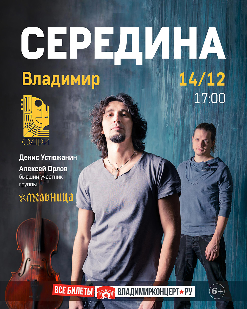 Концерты во Владимире Концерт группы «Середина»14 декабря 2025 в 17:00 «Середина» — последние романтики, выбирающие путь радости в дебрях постмодерна. Нежные, философские песни о море, любви и внутренней свободе. Яркий вокал, поэзия текстов, тёплый саунд виолончели. Состав музыкантов: Денис Устюжанин — лидер и создатель группы, автор песен, гитара, вокал Алексей Орлов — виолончель. С Алексеем многие знакомы по группе «Мельница» Цена билета: 1000 руб. Билеты по ссылке: https://vk.cc/cQXH2K Дата: 14 декабря 2025 Начало: в 17.00 Место проведения: Владимирский областной Дом работников искусств Адрес: г. Владимир, ул. Гоголя, 2 Информация с https://vladodri.ru/events/koncert-gruppy-seredina/ « вернуться владимирская афиша другие концерты во Владимире |