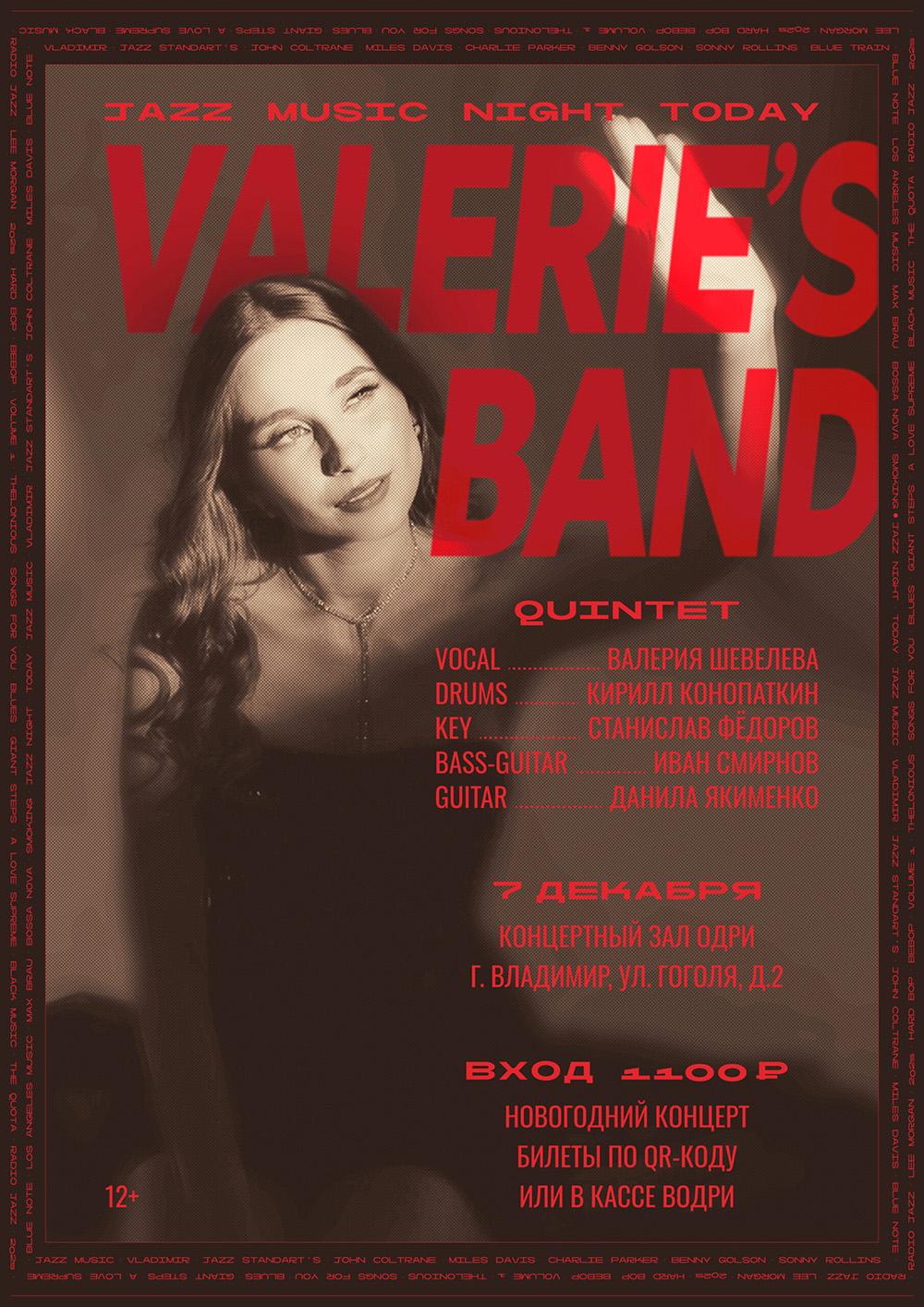 Концерты во Владимире Джазовый концерт «Valerie’s Band»07 декабря 2025 в 18:00 В составе коллектива -лучшие музыканты Владимира и гости из Москвы: Валерия Шевелева — выпускница Владимирского Областного Музыкального Колледжа, лауреат всероссийских и международных конкурсов и фестивалей, педагог и артист различных музыкальных проектов. Данила Якименко, джазовый гитарист, лауреат международных и всероссийских конкурсов: Кирилл Конопаткин — ударные, соавтор идеи проекта, лауреат всероссийских конкурсов, студент московской «Академии Джаза» Игоря Бутмана. Иван Смирнов — бас-гитара, один из лучших басистов Владимирской области, музыкант Областного Дворца Культуры и Искусства, настоящий профессионал своего дела. Станислав Фёдоров — лучший джазовый пианист Владимира и области, участник огромного количества музыкальных проектов и фестивалей Цена билета: 1100 руб. Билеты по ссылке: https://vladimirkoncert.ru/shows/event/10174-Dzhazovyi-kontsert-Valerie-s-Band Дата: 07 декабря 2025 Начало: в 18.00 Место проведения: Владимирский областной Дом работников искусств Адрес: г. Владимир, ул. Гоголя, 2 Информация с https://vladodri.ru/events/dzhazovyj-koncert-valerie-s-band-2/ « вернуться владимирская афиша другие концерты во Владимире |