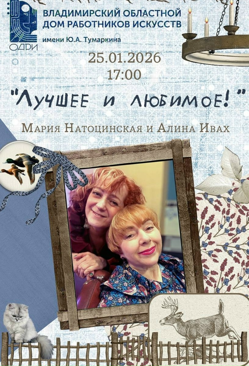 Концерты во Владимире Концерт Алины Ивах и Марии Натоцинской25 января 2026 в 17:00 Концерт перенесен с 16 ноября на 25 января. Очередной концерт полюбившегося владимирцам творческого дуэта — Марии Натоцинской и Алины Ивах (г.Москва). Алина Ивах(вокал), неоднократный призер всероссийского конкурса «Поют драматические актеры». Актриса Московского губернского театра. Мария Натоцинская (фортепиано) — концертмейстер Российской Академии Музыки им Гнесиных. Цена билета: 900 руб. Билеты по ссылке: https://vk.cc/cR8iZc Дата: 25 января 2025 Начало: в 17.00 Место проведения: Владимирский областной Дом работников искусств Адрес: г. Владимир, ул. Гоголя, 2 Информация с https://vladodri.ru/events/koncert-aliny-ivah-i-marii-natocinskoj-3/ « вернуться владимирская афиша другие концерты во Владимире |