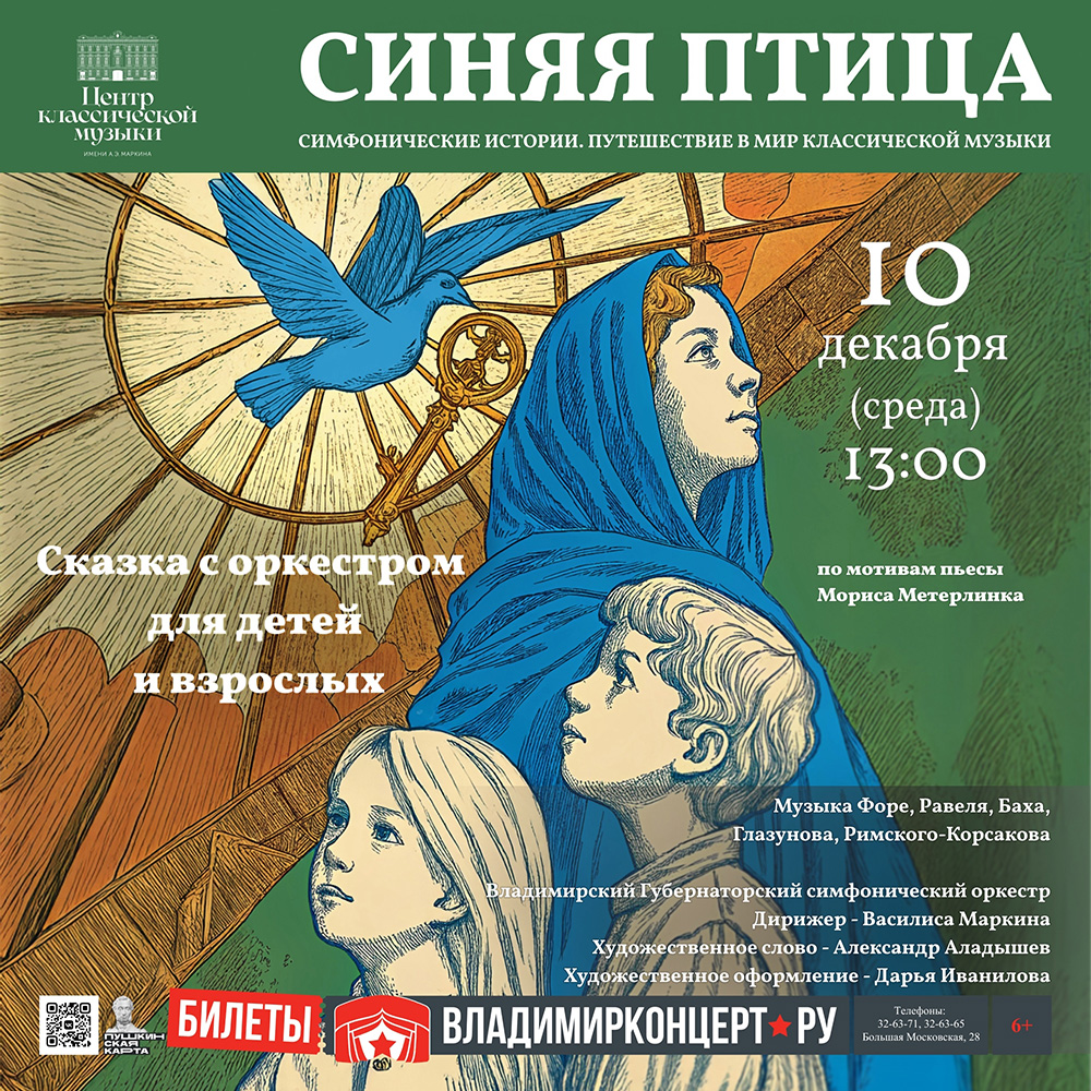 Концерты во Владимире Сказка с оркестром для детей и взрослых «Синяя птица»10 декабря 2025 в 13:00 «Синяя птица» — философская сказка бельгийского писателя и драматурга Мориса Метерлинка о вечном поиске счастья. В рождественскую ночь брат и сестра, Тильтиль и Митиль, отправляются в опасное путешествие. Их попросила об этом фея Берилюна, чтобы спасти свою больную внучку. В пути детей сопровождают пёс Тило и кошка Тилетта, а также ожившие Огонь, Вода, Тесто и Сахар. Герои попадают в Страну воспоминаний, владения Ночи, чудесные сады Радости и даже в Царство Будущего. Но те птицы, которых они встречают, хоть и синего цвета, но, попадая на белый свет, то умирают, то становятся обычными серыми птичками. В результате путешественники возвращаются домой ни с чем, но дома их ждёт сюрприз: оказывается, чудесной птицей является горлица, которая живёт в их доме. Её и отдают заболевшей внучке соседки тетушки Берленго, которую дети ночью приняли за фею. Мораль сказки такова: истинное счастье находится не в материальных вещах, а в простых радостях и отношениях. Сказка учит ценить то, что имеешь, и видеть красоту в окружающем мире. Владимирский Губернаторский симфонический оркестр под управлением Василисы МАРКИНОЙ Художественное слово, актер Владимирского драматического театра - Александр АЛАДЫШЕВ Художественное оформление - Дарья ИВАНИЛОВА. Музыка Г. Форе, И. С. Баха, А. Глазунова, Н. Римского-Корсакова, П. И. Чайковского. Дата: 10 декабря 2025 года Начало: в 13:00 Место: Центр классической музыки Билеты в кассе Центра классической музыки по адресу: ул. Большая Московская, 28 Ежедневно с 10:00 до 19:00 (14:00-15:00 перерыв на обед) ПРОГРАММА ДОСТУПНА К ПОСЕЩЕНИЮ ПО ПУШКИНСКОЙ КАРТЕ Билеты по ссылке: https://vk.cc/cRBEfu Телефоны для справок: 8 (4922) 32-27-71; 32-63-65 Информация с https://www.vgso.ru/?menu=concert&number=1095 « вернуться владимирская афиша другие концерты во Владимире |