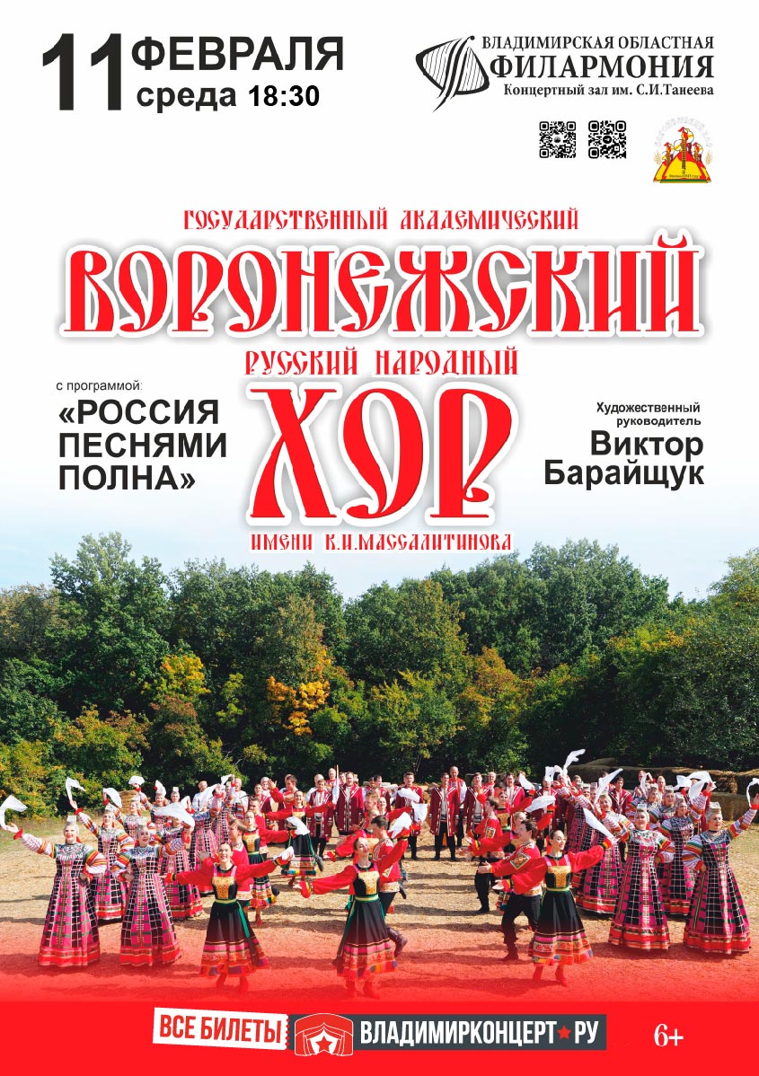 Концерты во Владимире Воронежский русский народный хор с программой «Россия песнями полна»11 февраля 2026 в 18:30 Государственный академический Воронежский русский народный хор им. К.И.Массалитинова – гордость и «визитная карточка» Воронежского края. Зрители увидят яркое, красочное действие с масштабными вокально-хореографическими композициями из «Золотого фонда» репертуара коллектива, а также новые тематические постановки! Большое место в программе занимают произведения патриотического содержания, которые звучат сегодня как никогда актуально! В своей особой манере, основанной на звучании низких бархатных женских голосов, хор исполнит популярнейшие народные песни. В исполнении оркестра прозвучат инструментальные пьесы на темы русских народных песен. Восторг и восхищение вызывает блистательное разнообразие сценических костюмов и высочайшее исполнительское мастерство артистов. Незабываемое, динамичное действие, вихрь плясок и хороводов Воронежского хора, завораживает зрителей, согревает души и сердца, заряжает колоссальной энергией, вызывает подъём патриотических чувств. Продолжительность: 1 час 20 минут без антракта Цена билета: 800-2000 руб. Билеты по ссылке: https://vk.cc/cTVLdd Дата: 11 февраля 2026 Начало: в 18.30 Место проведения: Владимирская областная филармония Адрес: г. Владимир, проспект Ленина, дом 1 Информация с https://www.vladfilarmonia.ru/afisha/concerts-in-vladimir/gosudarstvennyy-akademicheskiy-voronezhskiy-russkiy-narodnyy-khor-im-k-i-massalitinova-s-programmoy-/ « вернуться владимирская афиша другие концерты во Владимире |