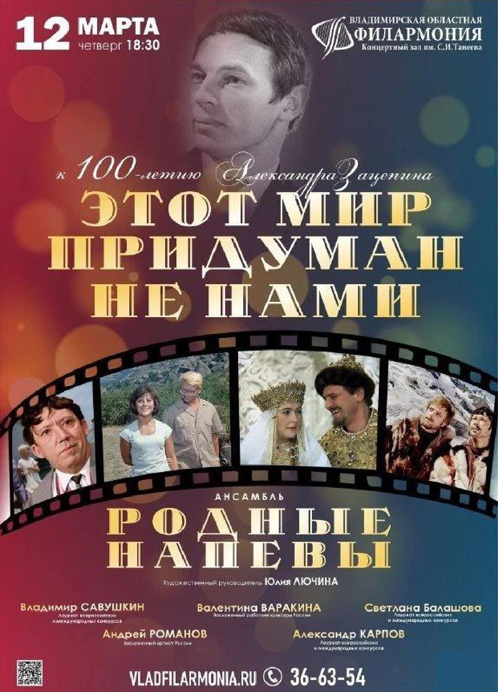 Концерты во Владимире Ансамбль «Родные напевы» с программой «ЭТОТ МИР ПРИДУМАН НЕ НАМИ» (6+)12 марта 2026 в 18:30 В свой юбилейный год ансамбль «Родные напевы» представит концертную программу, посвящённую 100-летию со дня рождения Александра Зацепина - композитора, чья музыка стала неотъемлемой частью жизни нескольких поколений, продолжая звучать и сегодня, объединяя сердца и поколения. Его имя неразрывно связано с отечественными фильмами, давно ставшими классикой: «Кавказская пленница», «Бриллиантовая рука», «Иван Васильевич меняет профессию», «Земля Санникова» и многими другими. Его музыка полна тепла, юмора и оптимизма. В концертной программе ансамбль «Родные напевы» продемонстрирует свежий взгляд на знакомые мелодии, сохранив их дух, узнаваемость и эмоциональную силу. Для вас прозвучат знаменитые песни и инструментальные темы, знакомые зрителям всего мира: «Есть только миг», «Разговор со счастьем», «Этот мир придуман не нами», «Остров невезения», «Звенит январская вьюга», «Песенка про медведей» и др. В программе: песни на музыку Александра Зацепина Продолжительность: 1 час 20 минут без антракта Цена билета: 500-700 руб. Билеты по ссылке: https://iframeab-pre10088.intickets.ru/seance/69785611 Дата: 12 марта 2026 Начало: в 18.30 Место проведения: Владимирская областная филармония Адрес: г. Владимир, проспект Ленина, дом 1 Информация с https://www.vladfilarmonia.ru/afisha/concerts-in-vladimir/kontsertnaya-programma-etot-mir-priduman-ne-nami-/ « вернуться владимирская афиша другие концерты во Владимире |