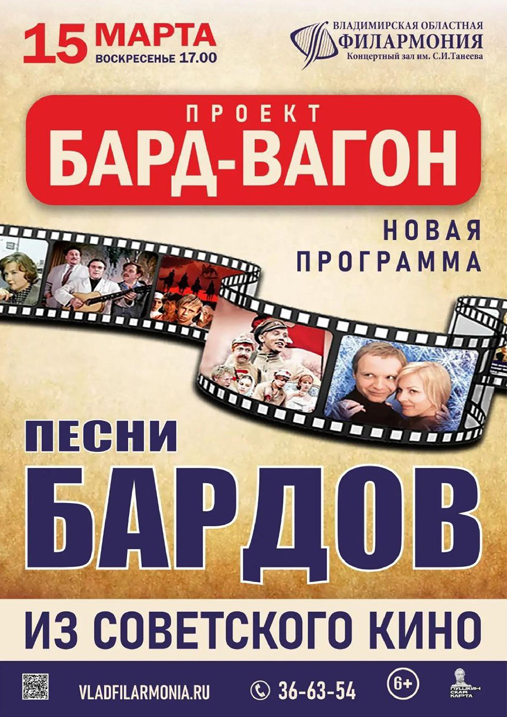 Концерты во Владимире Проект «БАРД-ВАГОН» с программой «ПЕСНИ БАРДОВ ИЗ СОВЕТСКОГО КИНО» (6+)15 марта 2026 в 17:00 Проект «БАРД-ВАГОН» (Россия) – единственный гастролирующий коллектив, работающий в жанре классической бардовской песни, состоящий из бардов и профессиональных музыкантов. Широкий набор голосов и музыкальных инструментов, интересные аранжировки, душевность исполнения, бережное отношение к интонациям авторов песен позволяют коллективу выступать на различных концертных площадках нашей страны. У проекта есть своя зрительская аудитория и во Владимире. На этот раз в рамках проекта коллектив представит программу «ПЕСНИ БАРДОВ ИЗ СОВЕТСКОГО КИНО». В программе прозвучит около 30 (!) песен из кинофильмов – таких, как «Бумбараш», «Белое солнце пустыни», «12 стульев», «Белорусский вокзал» и многие другие. В составе ансамбля «БАРД-ВАГОН» - лауреаты всероссийских фестивалей авторской песни и профессиональные музыканты: Михаил Новиков (вокал, гитара, руководитель проекта) Василий Галкин (скрипка, вокал, перкуссия) Константин Паникаровский (аккордеон, фортепиано) Сергей Миронов (акустический безладовый бас, вокал) Александр Пикалев (саксофон) Продолжительность: 2 часа с антрактом Цена билета: 600-1200 руб. Доступно приобретение билетов по Пушкинской карте Билеты по ссылке: https://iframeab-pre10088.intickets.ru/seance/68585377 Дата: 15 марта 2026 Начало: в 17.00 Место проведения: Владимирская областная филармония Адрес: г. Владимир, проспект Ленина, дом 1 Информация с https://www.vladfilarmonia.ru/afisha/concerts-in-vladimir/proekt-bard-vagon-s-programmoy-pesni-bardov-iz-sovetskogo-kino/ « вернуться владимирская афиша другие концерты во Владимире |