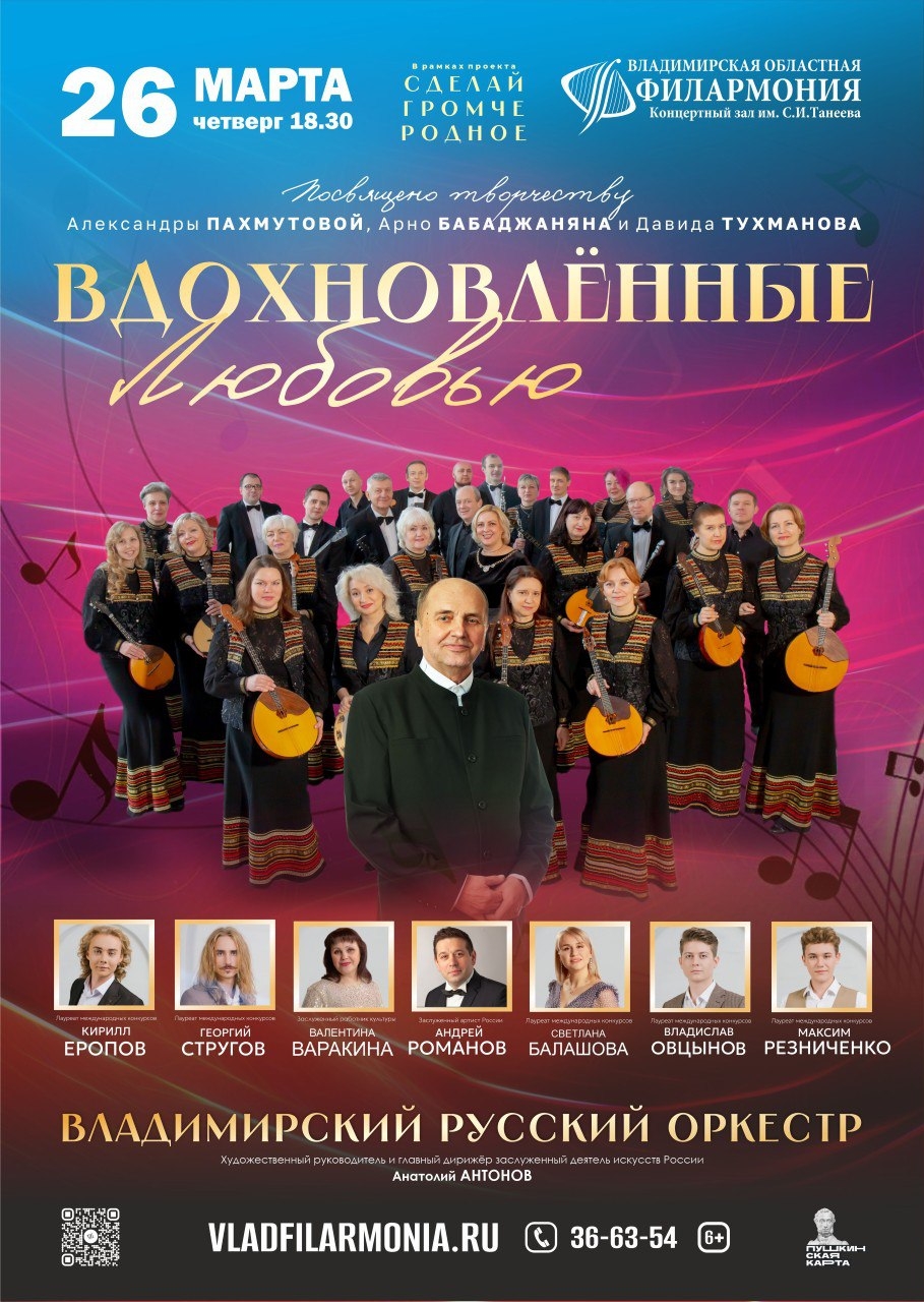 Концерты во Владимире Владимирский русский оркестр с программой «Вдохновлённые любовью» (6+)26 марта 2026 в 18:30 Абонемент №22 «Пушкин зовёт», концерт №4 В рамках проекта «СДЕЛАЙ ГРОМЧЕ РОДНОЕ» Владимирская филармония представляет уникальную программу, незабываемое музыкальное путешествие сквозь десятилетия - концерт, посвящённый творчеству легендарных композиторов советской эпохи: Арно Бабаджаняна, Александры Пахмутовой и Давида Тухманова. В программе - золотые хиты, ставшие неотъемлемой частью нашей культурной памяти. Вы услышите: пронзительные баллады и лирические шедевры Арно Бабаджаняна («Королева красоты», «Твои следы», «Чертово колесо»); вдохновляющие, полные энергии песни Александры Пахмутовой («Надежда», «Мелодия»); стильные, новаторские композиции Давида Тухманова («Вечная любовь, «Эти глаза напротив», «Напрасные слова»). Зрителей ждёт виртуозное исполнение оркестром и солистами; новые аранжировки знакомых мелодий; атмосфера тепла и ностальгии; возможность вновь пережить эмоции, связанные с любимыми песнями. Исполнители: ВЛАДИМИРСКИЙ РУССКИЙ ОРКЕСТР Художественный руководитель и главный дирижёр - заслуженный деятель искусств России Анатолий АНТОНОВСолисты: Заслуженный артист России Андрей РОМАНОВ Заслуженный работник культуры России Валентина ВАРАКИНА Лауреаты всероссийских и международных конкурсов: Светлана БАЛАШОВА, Кирилл ЕРОПОВ, Владислав ОВЦЫНОВ, Максим РЕЗНИЧЕНКО, Георгий СТРУГОВ Этот концерт - не просто музыкальный вечер, а дань уважения гениям, чьи произведения пережили время и продолжают трогать сердца слушателей разных поколений. Не упустите шанс окунуться в мир великолепной музыки и вновь услышать песни, которые стали саундтреком целой эпохи! Приходите и убедитесь, что родные песни могут звучать громко, модно и по-современному! Продолжительность: 1 час 30 минут Цена билета: 600-1000 руб. Доступно приобретение билетов по Пушкинской карте Билеты по ссылке: https://iframeab-pre10088.intickets.ru/seance/65817959 Дата: 26 марта 2026 Начало: в 18.30 Место проведения: Владимирская областная филармония Адрес: г. Владимир, проспект Ленина, дом 1 Информация с https://www.vladfilarmonia.ru/afisha/concerts-in-vladimir/vladimirskiy-russkiy-orkestr-s-programmoy-vdokhnovlyennye-lyubovyu-babadzhanyan-pakhmutova-tukhmanov/ « вернуться владимирская афиша другие концерты во Владимире |