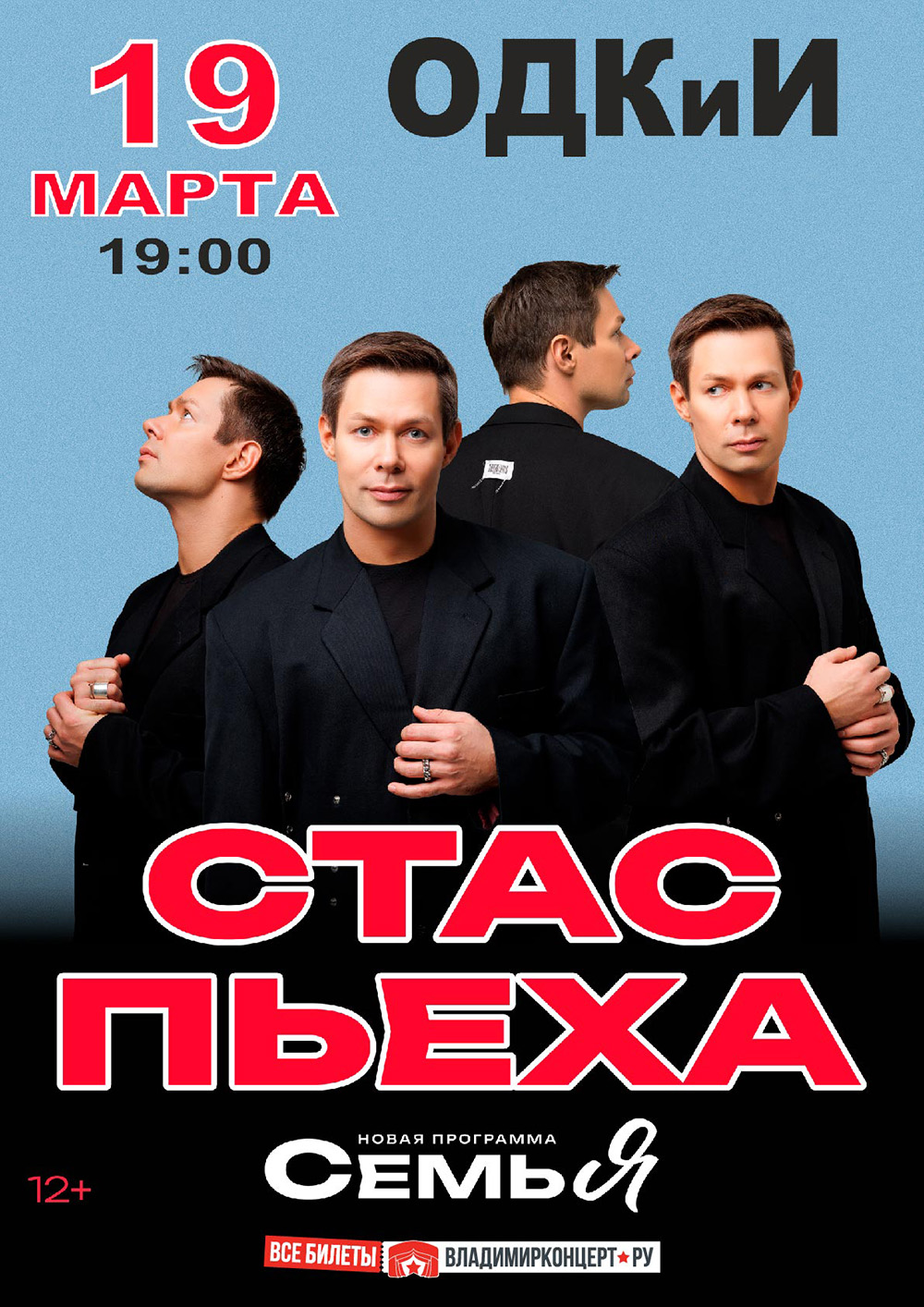 Концерты во Владимире Стас Пьеха19 марта 2026 в 19:00 Каждая песня этого Артиста остаётся в сердцах слушателей! Харизматичный, талантливый и честный, он не гонится за звездными скандалами и эпатажным имиджем. Уже много лет он занимает свое особенное место на Российской сцене! Вас ждет яркий и неповторимый вечер! «Мне повезло, что я артист не театра, а сцены, где я искренне выдаю самого себя, – признается Стас, – я не люблю шаблоны и клише, которые больше напоминают притворство, я всегда показываю себя самого, наверное, тем самым вызываю доверие у зрителя. И пусть этот вечер будет наполнен теплом ваших сердец, непринужденной дружеской атмосферой и прекрасной музыкой, которую подарит всем ценителям настоящего замечательный голос Стаса Пьехи! Цена билета: 3000-6500 руб. Билеты по ссылке: https://vladimirkoncert.ru/shows/event/10567-Stas-Pekha Дата: 19 марта 2026 Начало: в 19.00 Место проведения: Областной Дворец культуры и искусства Адрес: г. Владимир, ул. Диктора Левитана, д. 4 Информация с http://odk33.ru/afisha/stas-pexa « вернуться владимирская афиша другие концерты во Владимире |