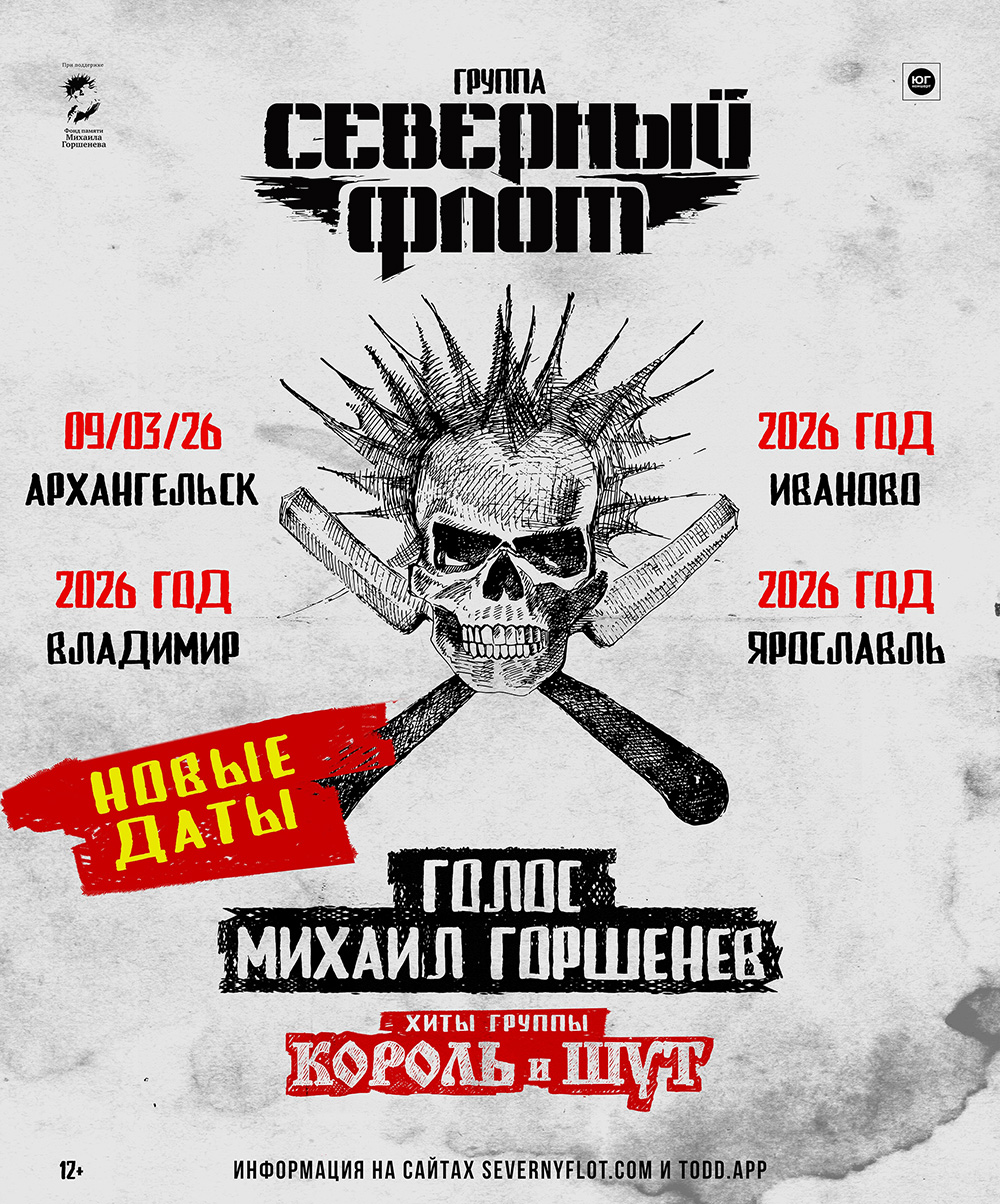 Концерты во Владимире Группа «Северный Флот»06 апреля 2026 в 19:00 Концерт ПЕРЕНЕСЁН, новая дата уточняется ВНИМАНИЕ! В нашем концертном расписании произошли изменения. К сожалению, в силу ряда причин, мы не сможем привезти концерт TODD с симфоническим оркестром в Архангельск, Владимир, Иваново и Ярославль. Поэтому концерты в этих городах переносятся на 2026 год и пройдут с совершенно новой программой хитов группы Король и Шут с голосом Михаила Горшенёва! Концерт в Архангельске состоится 9 марта в "Норд Экспо", даты концертов во Владимире, Иваново и Ярославле в данный момент уточняются, скоро мы опубликуем их в отдельном анонсе. Остальные концерты тура TODD с симфоническим оркестром пройдут по расписанию. Надеемся на ваше понимание в сложившейся ситуации и с нетерпением ждём встречи на будущих концертах! 6 апреля на сцене владимирского Арт Холла в рамках масштабного гастрольного тура с большой программой из хитов легендарного «Короля и Шута» и голосом Михаила Горшенёва выступит группа «Северный Флот»! Основным голосом этих уникальных концертов станет вокал легендарного Горшка. Со сцены прозвучат аутентичные вокальные дорожки бессмертного рок-героя, специально подобранные из наиболее ярких концертных выступлений легендарной команды. Зрителей ждут самые главные и любимые песни «Короля и Шута» в потрясающем сценическом воплощении, для каждой из которых создаётся уникальный видеоряд, главным героем которого станет «оживший» образ Горшка! Сценография концертов будет представлена тремя панорамными экранами, которые с помощью атмосферных видеосюжетов создадут эффект дополненной реальности и погрузят зрителей в сказочный мир любимых песен. Для вас выступят те самые музыканты из оригинального состава «Короля и Шута», выступающие под знаменем группы «Северный Флот». Вы вновь услышите оригинальный звук и фирменное исполнение творческого наследия великой команды. Не упустите возможность посетить мультимедийное панк-рок-шоу группы «Северный Флот» с голосом Горшка и бессмертными хитами «Короля и Шута»! Тур проводится при поддержке Фонда Памяти Михаила Горшенёва. Билеты: https://vk.cc/cRBLs6 Дата: 06 апреля 2026 Начало: в 19.00 Место: Арт Холл Адрес: г. Владимир, ул. Северная, 2А Информация с https://vk.com/kish_vladimir_2026 « вернуться владимирская афиша другие концерты во Владимире |