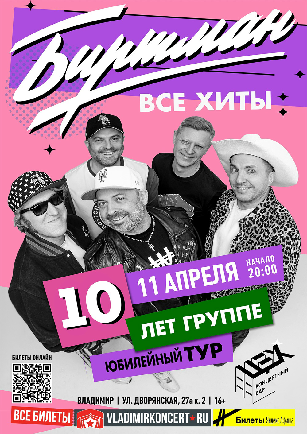 Концерты во Владимире Группа "Биртман"11 апреля 2026 в 20:00 Грандиозный концерт коллектива БИРТМАН с программой "10 лет группе". 11 апреля вспомним шлягеры ранних альбомов и споем все новые хиты в концертном баре "Цех". И помните: «Не повторятся такое никогда» ... Билеты онлайн без наценок и сборов: мvk.cc/cTo3UB Билеты также в продаже в кассах "Владимир-Концерт" и на Яндекс Афише. Дата: 11 апреля 2026 Начало концерта: в 20.00 Место: Концертный бар "ЦЕХ" (ВЗПО Техника, бывший клуб «STUDIO») Адрес: г. Владимир, ул. Дворянская, 27А, корп. 2 Информация с https://vk.ru/birtman10let_vladimir2026 « вернуться владимирская афиша другие концерты во Владимире |