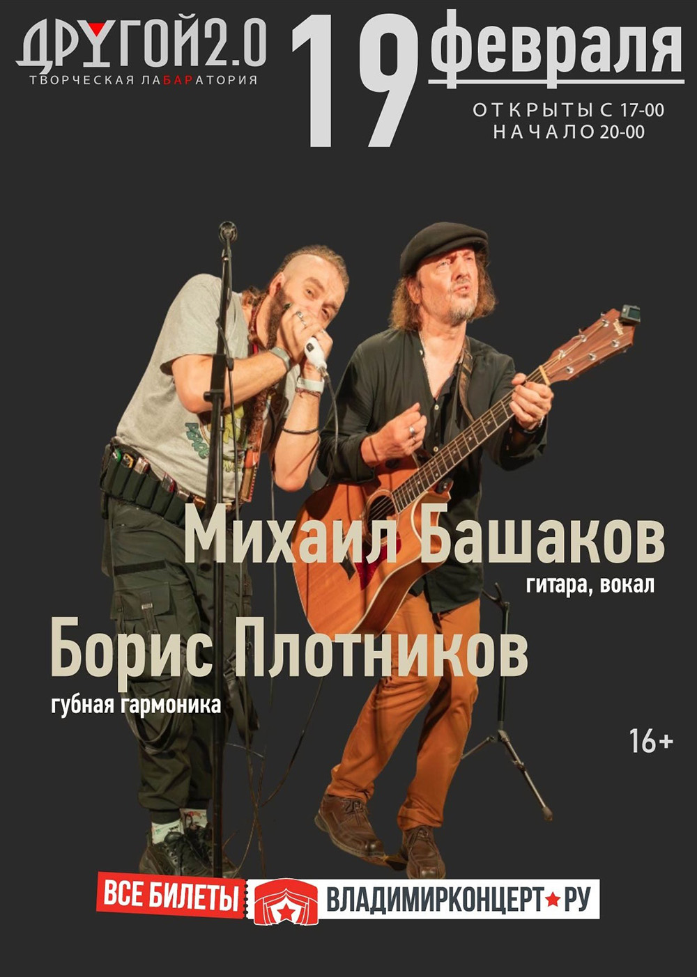 Концерты во Владимире Концерт Михаила Башакова и Бориса Плотникова19 февраля 2026 в 20:00 МИХАИЛ БАШАКОВ – уникальный автор-исполнитель с берегов Невы, песни которого на слуху буквально у каждого, кто хоть раз включал радио. Но по-настоящему повезло тем, кому довелось побывать на живых концертах исполнителя, будь то формат сольного акустического выступления, различных творческих тандемов с музыкантами-инструменталистами или боевое электричество группы БАШАКОВ BAND. И, лишь раз бросив взгляд на сцену, ты и правда веришь, что у этого человека под крылом солнце… Ведь не зря после каждого выступления люди выходят с открытыми счастливыми улыбками на лицах, напевая: «Нам нужен просто светлый день», поскольку именно таким всегда будет день, когда вы побывали на концерте Михаила Башакова! Михаил является автором более десяти музыкальных альбомов и двух поэтических сборников. Помимо постоянной концертной деятельности на территории России, регулярно гастролирует по Европе, Канаде и Америке, где его принимают с той же неизменной радостью и теплотой. БОРИС ПЛОТНИКОВ - профессиональный исполнитель на губной гармонике, преподаватель игры на губной гармонике. Музыкант, играющий на стыках разных стилей и жанров, призер двух международных конкурсов, выступает с авторским проектом "Борис Плотников и его Группа", с группой Евгения Маргулиса и Михаилом Башаковым. Цена билета: 1000-1900 руб. Билеты по ссылке: https://vk.cc/cUbKe1 Дата: 19 февраля 2026 Начало: в 20.00 Место проведения: Другой Бар 2.0 Адрес: Владимир, ул. Студёная гора, 36А Информация с https://vladimirkoncert.ru « вернуться владимирская афиша другие концерты во Владимире |