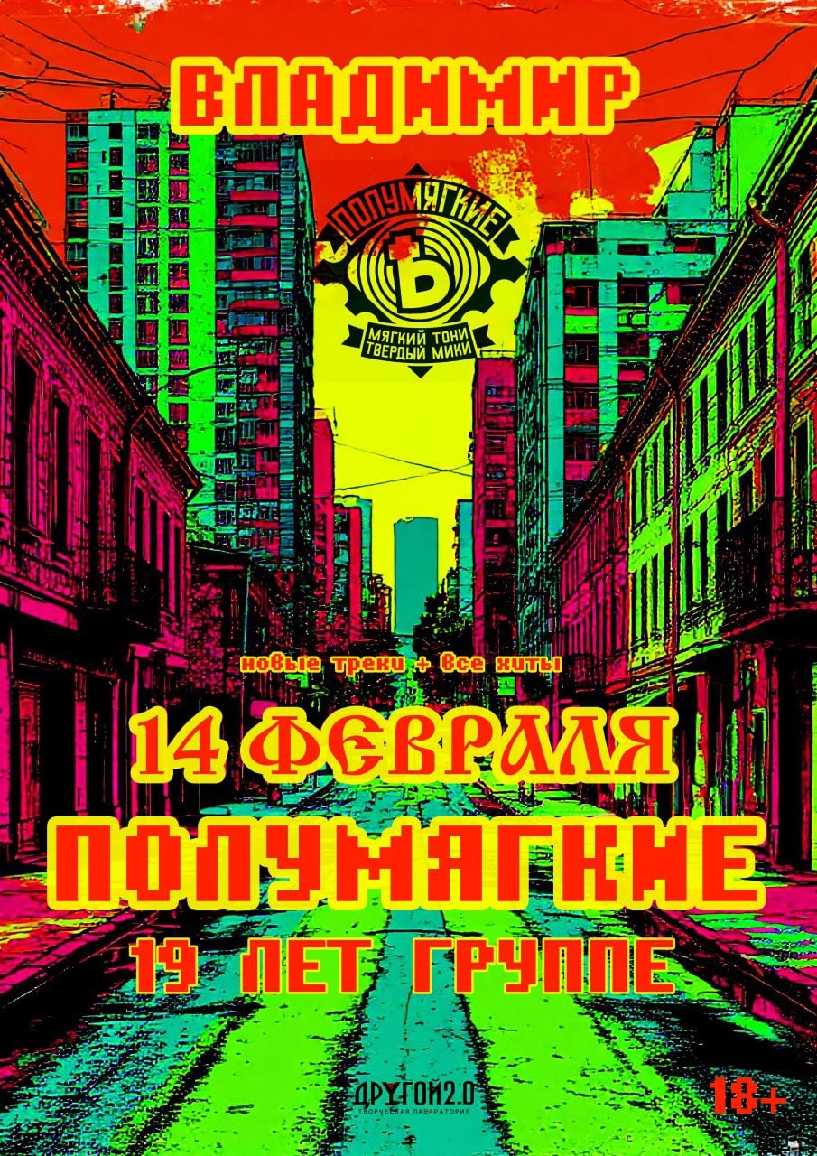 Концерты во Владимире Группа "Полумягкие"14 февраля 2026 в 21:00 День всех влюблённых отмечаем громко. 19 лет группе. Хиты, кач, фирменный звук и настоящий лайв. Твёрдый Мики и Мягкий Тони — во Владимире, в «Другом баре 2.0». Бронь: +7 (961) 251-10-10 Дата: 14 февраля 2026 Начало: в 21.00 Место проведения: Другой Бар 2.0 Адрес: Владимир, ул. Студёная гора, 36А Информация с https://vk.ru/wall-136740493_5805 « вернуться владимирская афиша другие концерты во Владимире |