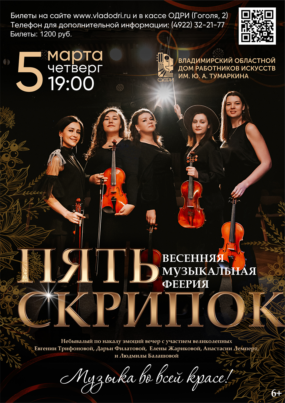 Концерты во Владимире «Пять скрипок» — весенний концерт проекта «Музыка во всей красе»05 марта 2026 в 19:00 В шоу-вечере «Пять скрипок» примут участие известные владимирские скрипачки: Людмила Балашова, Елена Жарикова, Анастасия Лемперт, Дарья Филатова и Евгения Трифонова. Продолжение проекта «Музыка во всей красе» во Владимирском областном доме работников искусств. Участницам предстоит создать на сцене три образа, эффектно исполнив разноплановые музыкальные произведения. Первый тур будет посвящен классическому звучанию скрипки, и акцент планируется сделать на сольном выступлении и исполнительском мастерстве музыкантов. Во второй части вечера девушки готовятся удивить зрителей современным прочтением скрипичной музыки и эффектно показать актуальность скрипки. Третья часть — творческая: каждая из скрипачек выберет, что играть, а главное с кем – задача участниц проекта удивить зрителей и показать все возможности своего инструмента. «Пять скрипок» — это красивое шоу, которое призвано продемонстрировать талант и профессиональное мастерство артисток, показать, как прекрасны девушки на сцене и в жизни, как они умеют заряжать зрителей своей энергией, как великолепна исполняемая ими музыка. Участницами проекта «Пять скрипок» вновь стали: Елена Жарикова – камерный струнный оркестр Владимирской областной филармонии Анастасия Лемперт – камерный струнный оркестр Владимирской областной филармонии Людмила Балашова – Владимирский губернаторский симфонический оркестр Евгения Трифонова — арт-проект Voice (г.Владимир). Дарья Филатова — группа «Фён» (г.Владимир) Продолжительность: 1 час 30 минут Цена билета: 1200 руб. Билеты в кассе ОДРИ и по ссылке: https://vk.cc/cUGPD3 Дата: 05 марта 2026 Начало: в 19.00 Место проведения: Владимирский областной Дом работников искусств Адрес: г. Владимир, ул. Гоголя, 2 Информация с https://vladodri.ru/events/pjat-skripok-vesennij-koncert-proekta-muzyka-vo-vsej-krase/ « вернуться владимирская афиша другие концерты во Владимире |