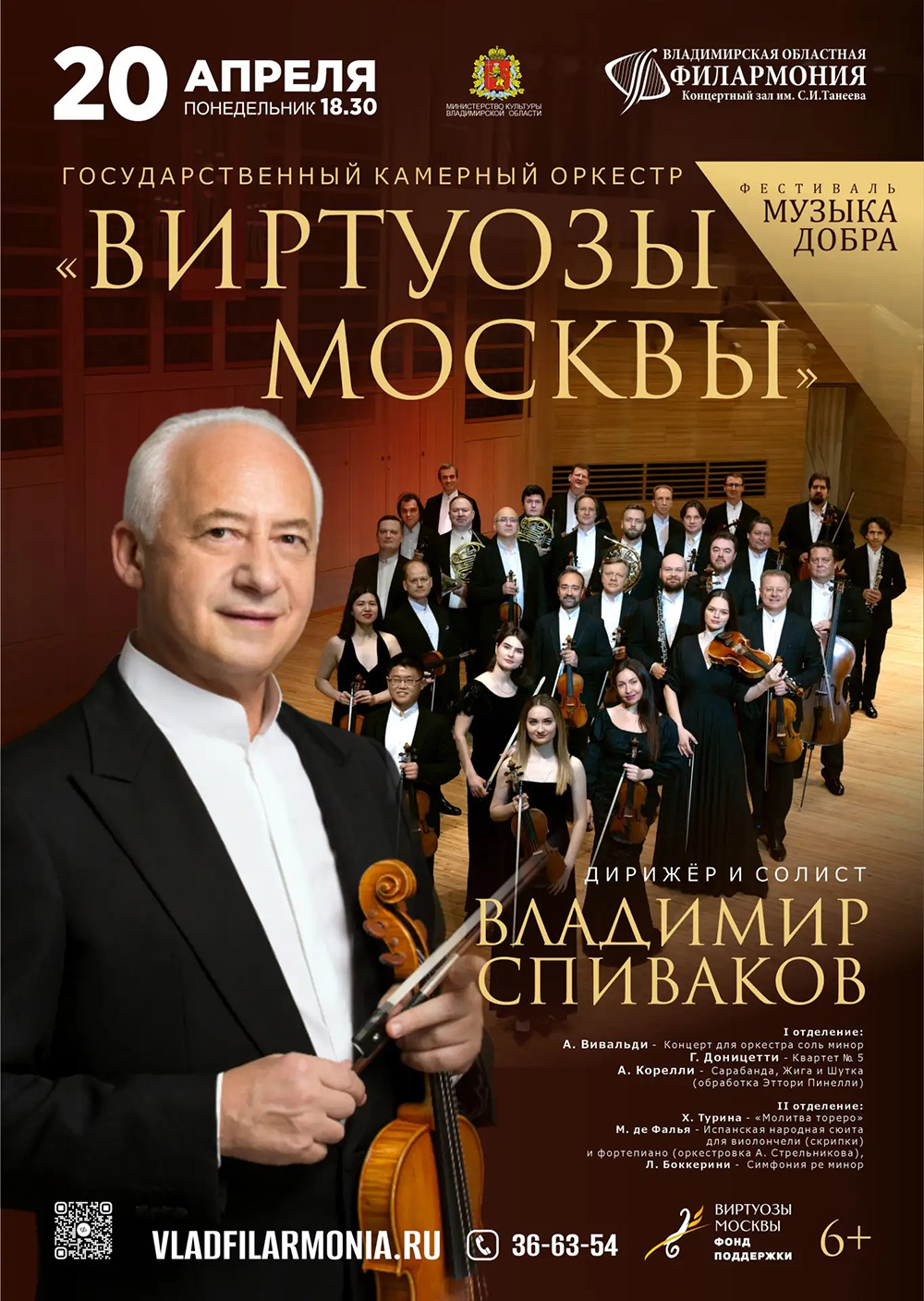 Концерты во Владимире Государственный камерный оркестр «Виртуозы Москвы»20 апреля 2026 в 18:30 Фестиваль «Музыка добра» «Виртуозы Москвы» – всемирно известный камерный оркестр, созданный Владимиром Спиваковым, в 2025 году отметившим своё 80-летие. Феноменальная артистическая свобода, высочайший профессионализм, выверенное ансамблевое звучание – все это слагаемые фирменного стиля «Виртуозов». Не удивительно, что Родион Щедрин назвал этот коллектив «восьмым чудом света». Репертуар «Виртуозов Москвы» богат и многогранен: на их концертах можно услышать классику и современные композиции. В каждом выступлении «Виртуозам Москвы» удается главное: продемонстрировать высокий профессиональный исполнительский уровень, эмоционально взволновать и интеллектуально увлечь любого, пусть даже неподготовленного человека, подарить ему радость общения с музыкальными шедеврами, возбудить в нем желание еще раз прийти на концерт. ПРОГРАММА КОНЦЕРТА: I отделение: А. Вивальди - Концерт для оркестра соль минор Г. Доницетти - Квартет № 5 А. Корелли - Сарабанда, Жига и Шутка (обработка Эттори Пинелли) II отделение: Х. Турина - «Молитва тореро» М. де Фалья - Испанская народная сюита для виолончели (скрипки) и фортепиано (оркестровка А. Стрельникова), солист – Владимир СПИВАКОВ Л. Боккерини - Симфония ре минор Продолжительность: 2 часа с антрактом Исполнители: Государственный камерный оркестр «ВИРТУОЗЫ МОСКВЫ» Цена билета: 4000-5500 руб. Билеты по ссылке: https://iframeab-pre10088.intickets.ru/seance/70315396 Дата: 20 апреля 2026 Начало: в 18.30 Место проведения: Владимирская областная филармония Адрес: г. Владимир, проспект Ленина, дом 1 Информация с https://www.vladfilarmonia.ru/afisha/concerts-in-vladimir/gko-virtuozy-moskvy-dirizher-i-solist-vladimir-spivakov/ « вернуться владимирская афиша другие концерты во Владимире |