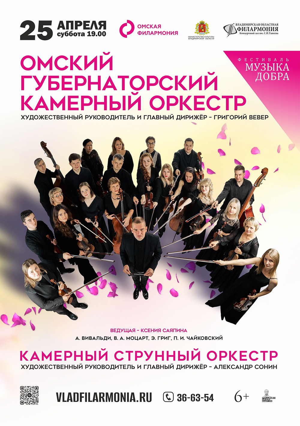 Концерты во Владимире Омский губернаторский камерный оркестр с программой «Классика на все времена»25 апреля 2026 в 19:00 Торжественное закрытие фестиваля «Музыка добра» Закрытие фестиваля «Музыка добра» доверено Омскому губернаторскому камерному оркестру под руководством Григория Вевера при участии Камерного струнного оркестра Владимирской филармонии. Омский камерный оркестр, один из ведущих коллективов «Омской филармонии», был основан в 1991 г. С 2019 года главным дирижером Омского камерного оркестра стал Григорий Вевер. Оркестр исполняет музыку разнообразных эпох, жанров и стилей: от старинной классики Баха и Генделя до современных опусов, от балетных и оперных увертюр до джаза. В первом отделении в исполнении Омского оркестра прозвучат произведения Вивальди, Моцарта и Грига. Во втором - романтичность и эмоциональность - серенады П.И. Чайковского в исполнении уже двух оркестров тронут даже тех, кто далёк от классики… В программе: I отделение: А. Вивальди - Увертюра к опере «Олимпиада», RV 725 В.А. Моцарт- Дивертисмент для струнных фа мажор, KV 138 Э. Григ - «Две северные мелодии» для струнного оркестра, соч. 63 II отделение: П.И. Чайковский - Серенада для струнного оркестра до мажор, соч. 48 Ведущая: лектор-музыковед Ксения Саяпина (г. Омск) Продолжительность: 1 час 30 минут с антрактом Исполнители: Омский губернаторский камерный оркестр Художественный руководитель и главный дирижёр, заслуженный деятель культуры Омской области Григорий ВЕВЕР Камерный струнный оркестр Художественный руководитель Александр СОНИН Цена билета: 800-1600 руб. Доступно приобретение билетов по Пушкинской карте Билеты по ссылке: https://iframeab-pre10088.intickets.ru/seance/70344093 Дата: 25 апреля 2026 Начало: в 19.00 Место проведения: Владимирская областная филармония Адрес: г. Владимир, проспект Ленина, дом 1 Информация с https://www.vladfilarmonia.ru/afisha/concerts-in-vladimir/omskiy-gubernatorskiy-kamernyy-orkestr-s-programmoy-klassika-na-vse-vremena/ « вернуться владимирская афиша другие концерты во Владимире |