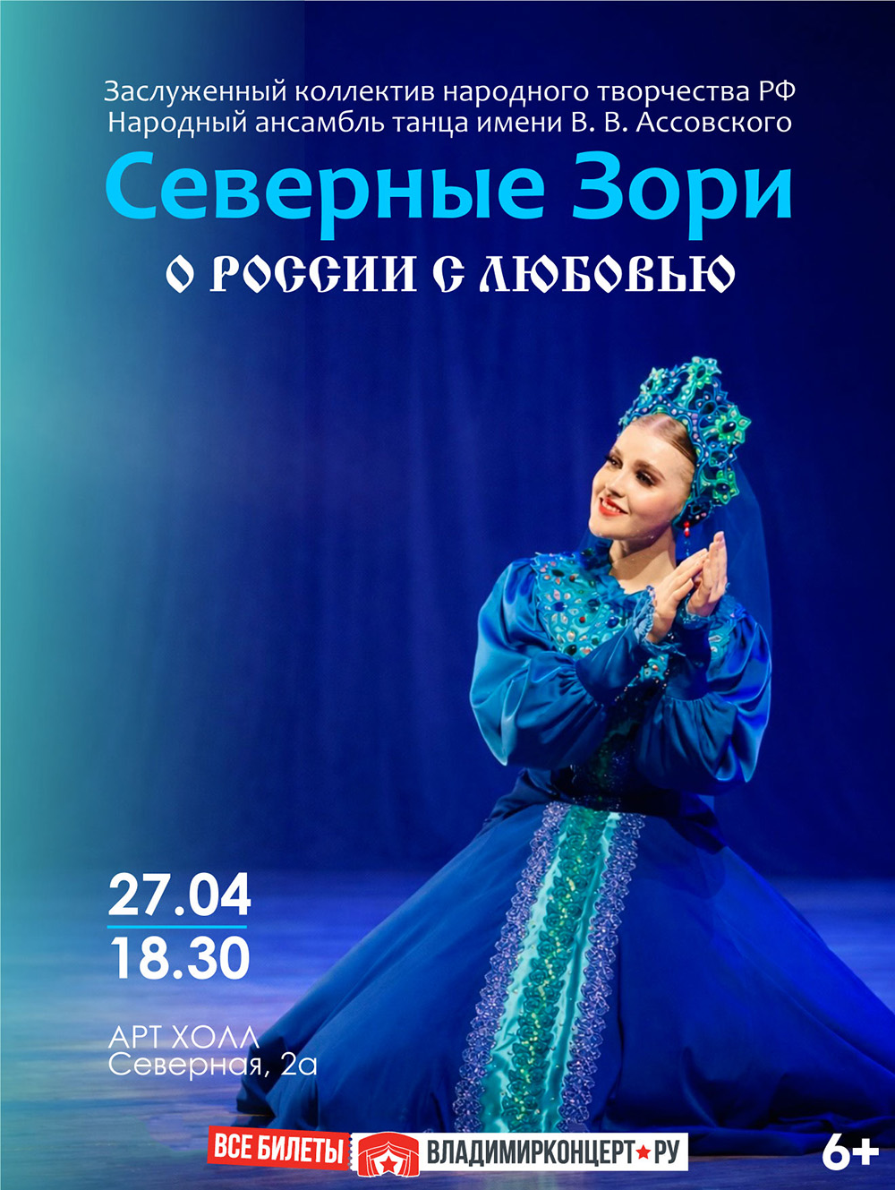 Концерты во Владимире Ансамбль танца «Северные зори» с программой «О России с любовью»27 апреля 2026 в 18:30 Заслуженный коллектив народного творчества Российской Федерации ансамбль танца «Северные зори» им. В.В. Ассовского (г. Череповец) представит вниманию зрителей концертную программу «О России с любовью» «Северные зори» - знаменитый творческий коллектив, собравший за плодотворные годы своей 60-летней истории все высшие награды и титулы всероссийских и международных хореографических конкурсов, неизменный участник крупнейших творческих событий в нашей стране и за рубежом. В программе "О России с любовью» коллектив представит Владимирскому зрителю яркие хореографические постановки своего репертуара, объединенные темой любви к России, ее неповторимой красоте, непростой истории и богатым традициям, любви к ее людям – открытым, смелым и талантливым. Художественный руководитель - заслуженный работник культуры Российской Федерации, дважды лауреат премии Правительства РФ «Душа России» Татьяна Изюмова. Организатор концерта Фонд развития народного танца Натальи Карташовой и Татьяны Реус (г. Челябинск) Цена билета: 500 руб. Билеты по ссылке: https://vk.cc/cUIWTd Дата: 27 апреля 2026 Начало: в 18.30 Место: Арт Холл Адрес: г. Владимир, ул. Северная, 2А Информация с https://arthall.org/events/kontserty/ansambl-tantsa-severnye-zori-s-programmoj-o-rossii-s-lyubovyu « вернуться владимирская афиша другие концерты во Владимире |