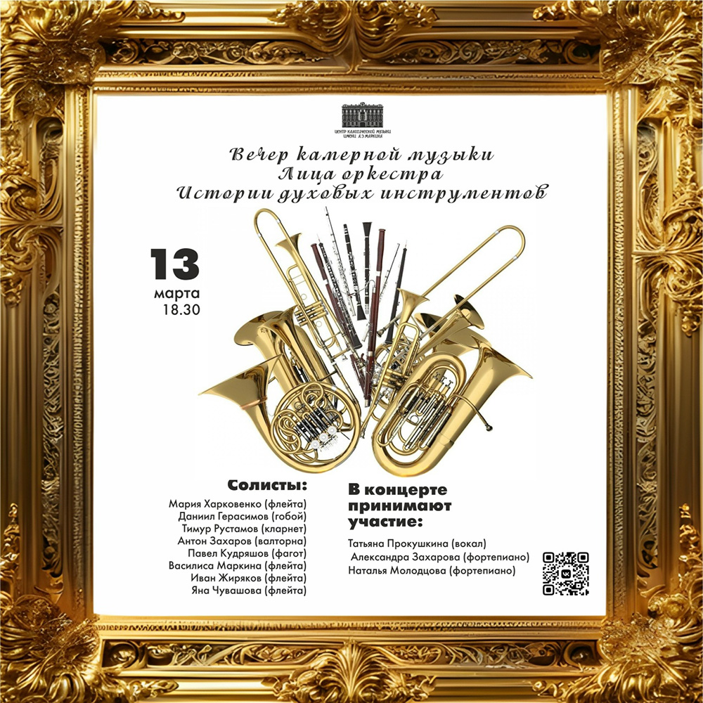 Концерты во Владимире «Лица оркестра. Истории духовых»13 марта 2026 в 18:30 Камерный концерт артистов группы деревянных и медных духовых инструментов Владимирского Губернаторского симфонического оркестра Солисты: Мария Харковенко (флейта) Даниил Герасимов (гобой) Тимур Рустамов (кларнет) Антон Захаров (валторна) Павел Кудряшов (фагот) Василиса Маркина (флейта) Иван Жиряков (флейта) Яна Чувашова (флейта) В концерте принимают участие: Татьяна Прокушкина (сопрано), Александра Захарова (фортепиано), Наталья Молодцова (фортепиано) В программе концерта музыка Шуберта, Таффанеля, Гобера, Пуленка, Форе, Франсе. Билеты по ссылке: https://www.vladimirkoncert.ru/shows/event/10081-Litsa-orkestra-Istorii-dukhovykh Дата: 13 марта 2026 Начало: в 18.30 Место проведения: Центр классической музыки имени А.Э. Маркина Адрес: г. Владимир, ул. Большая Московская, д. 28 Информация с https://vk.ru/wall-23958279_17913 « вернуться владимирская афиша другие концерты во Владимире |