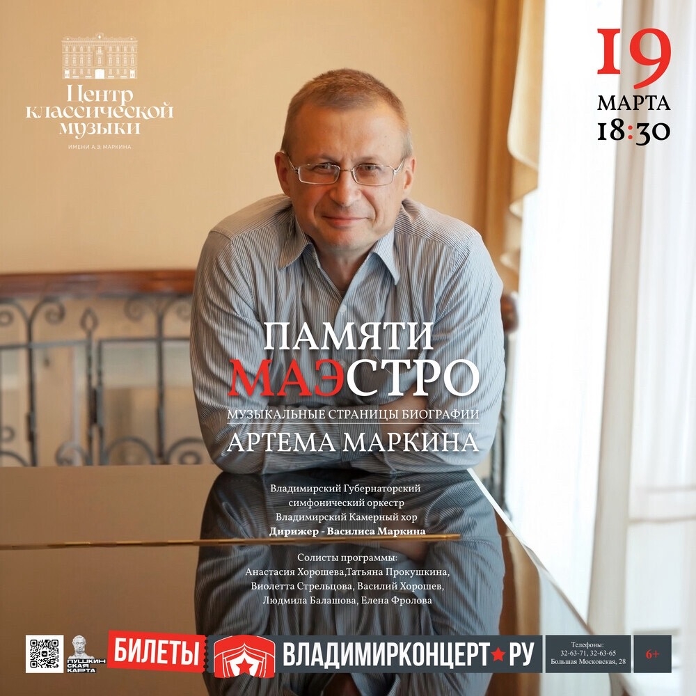 Концерты во Владимире "Памяти Маэстро"19 марта 2026 в 18:30 19 марта исполняется два года со дня, который оставил неизгладимый след в истории Центра классической музыки, ныне гордо носящего его имя. В память о Маэстро выступает Владимирский Губернаторский симфонический оркестр под его созданием. На сцене с оркестром — люди, которые сопровождали Артема Эдуардовича Маркина на протяжении его музыкального пути. И, конечно, величественная симфоническая музыка, которой он посвятил свою жизнь и в которую он крепко верил. В программе концерта музыка Чайковского, Рахманинова, Вагнера, Пярта, Малера и др. Владимирский Губернаторский симфонический оркестр под управлением Василисы Маркиной Владимирский Камерный хор (руководитель Николай Макаров) Солисты программы: Анастасия Хорошева | меццо-сопрано Татьяна Прокушкина | сопрано Виолетта Стрельцова | эстрадный вокал Василий Хорошев | контратенор Людмила Балашова | скрипка Елена Фролова | певица, поэт, композитор Билеты по ссылке: https://www.vladimirkoncert.ru/shows/event/10082-Pamyati-Maestro Действует Пушкинская карта Дата: 19 марта 2026 Начало: в 18.30 Место проведения: Центр классической музыки имени А.Э. Маркина Адрес: г. Владимир, ул. Большая Московская, д. 28 Информация с https://vk.ru/wall-23958279_17913 « вернуться владимирская афиша другие концерты во Владимире |
