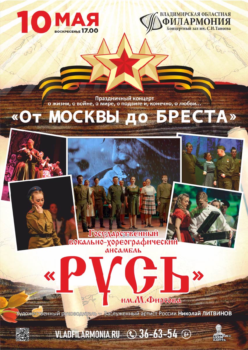 Концерты во Владимире Ансамбль «Русь» с программой «От Москвы до Бреста»10 мая 2026 в 17:00 О жизни, о войне, о мире, о подвиге и, конечно, о любви. Этот праздничный концерт Государственного вокально-хореографического ансамбля «Русь» им.М.Фирсова совмещает два главных мотива: всеобщую радость Победы и осознание, какой ценой она досталась. Программа «От Москвы до Бреста» посвящена Победе в Великой Отечественной войне. Постановка представляет собой театрализованное действие: вокально-хореографические композиции выстроены в единую линию как сказ о великом духе русского воина. Каждый номер - маленькая история со своей песней. Ансамбль «Русь» предстает здесь символом вечно живой, всенародной памяти и благодарности народу-победителю! В программе: всеми любимые песни военных лет, русские народные песни и танцы разных областей России Продолжительность: 1 час 30 минут без антракта Исполнители: Государственный вокально-хореографический ансамбль «РУСЬ» им. М.ФИРСОВА Цена билета: 500-800 руб. Доступно приобретение билетов по Пушкинской карте Билеты по ссылке: https://iframeab-pre10088.intickets.ru/seance/69863234 Дата: 10 мая 2026 Начало: в 17.00 Место проведения: Владимирская областная филармония Адрес: г. Владимир, проспект Ленина, дом 1 Информация с https://www.vladfilarmonia.ru/afisha/concerts-in-vladimir/ansambl-rus-s-programmoy-ot-moskvy-do-bresta_26/ « вернуться владимирская афиша другие концерты во Владимире |