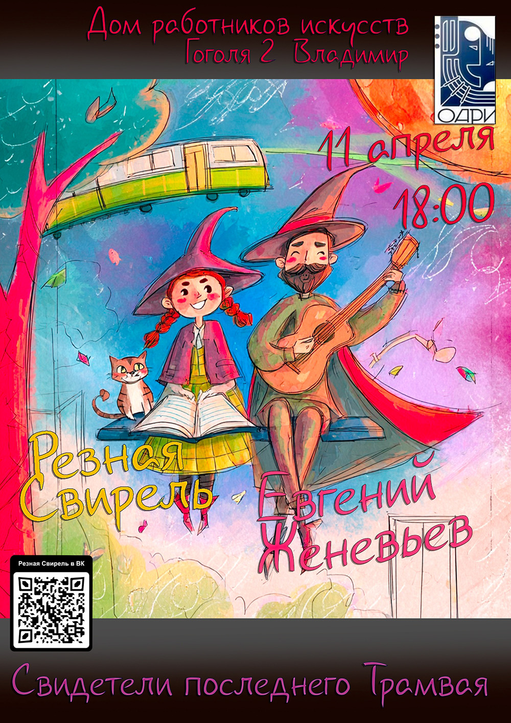 Концерты во Владимире Резная Свирель и Евгений Женевьев11 апреля 2026 в 18:00 11 апреля — концерт Резной Свирели и Евгения Женевьева во Владимире. Совсем скоро Резная Свирель и Евгений Женевьев обнимут загрустивших домовых, сложат сказки в рюкзаки, возьмут разноцветное небо для будущих самолетиков и счастливо отправятся на Последнем Трамвае в весеннее путешествие под звуки губной гармошки, ворчание чемодана и вздохи железнодорожных драконов. Тем более, год не простой, а юбилейный. Ровно пять лет назад случился самый первый концерт Свирели и Женевьева. Резная Свирель (Наталья Захарцева) — поэтесса и сказочница из Самары. В еë историях переплетаются реальность и волшебство, обыденные вещи превращаются в волшебные, бродячие ветры живут на маяках, смерти нет, добрые боги сидят в кофейнях и всегда всё хорошо. Евгений Женевьев — московский композитор и гитарист. В программе исполняет песни на стихи Натальи. Известен своей особенной манерой выступлений, включая фирменный атрибут — шляпу волшебника. Цена билета: 1500 руб. Билеты в кассе ОДРИ и по ссылке: https://vk.cc/cVJASJ Дата: 11 апреля 2026 Начало: в 18.00 Место проведения: Владимирский областной Дом работников искусств Адрес: г. Владимир, ул. Гоголя, 2 Информация с https://vladodri.ru/events/koncert-reznoj-svireli-i-evgenija-zheneveva/ « вернуться владимирская афиша другие концерты во Владимире |