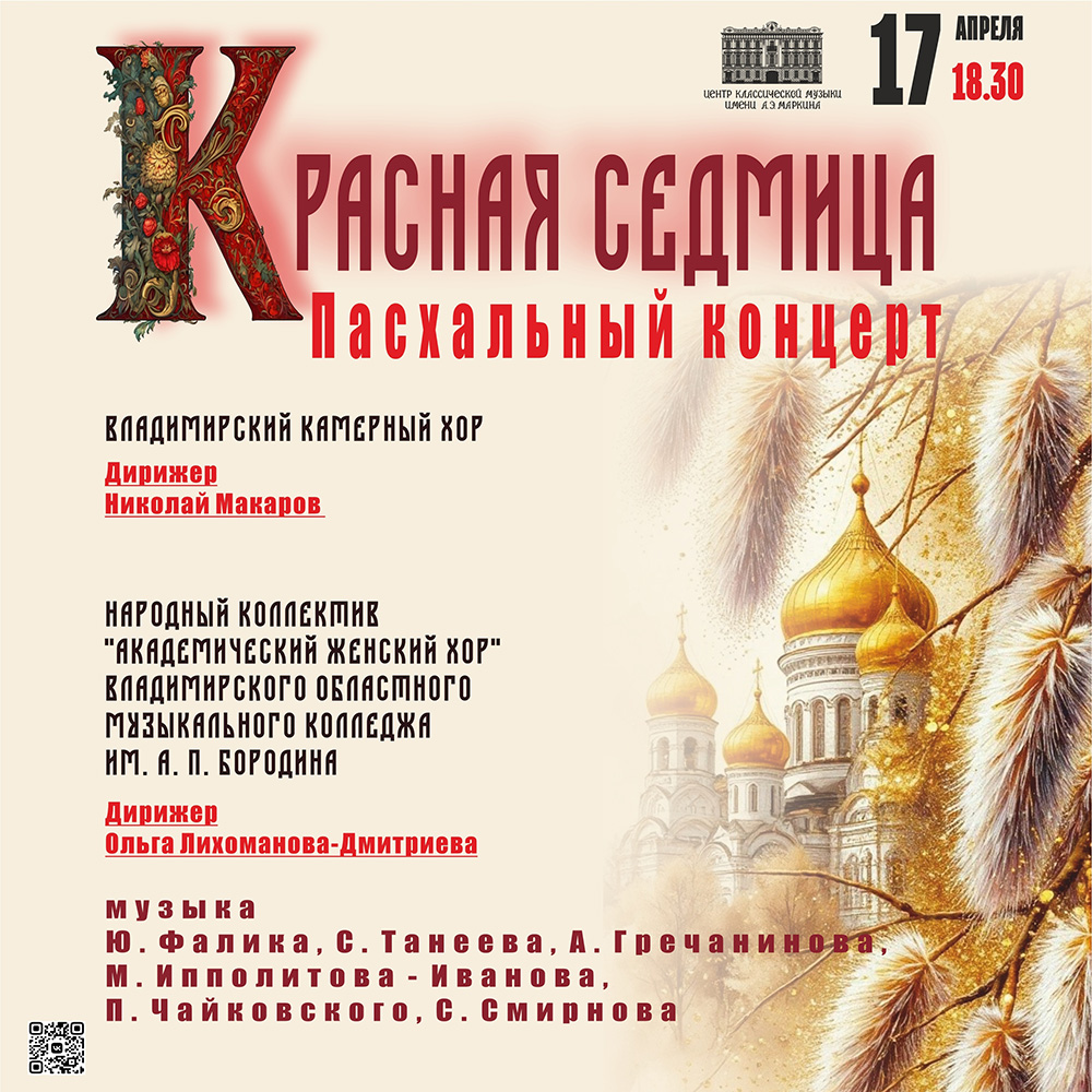 Концерты во Владимире Пасхальный концерт «Красная седмица»17 апреля 2026 в 18:30 Время особой духовной радости, когда в храмах продолжаются праздничные богослужения, открыты царские врата и совершаются крестные ходы. Этот знаменательный период символизирует ликование по поводу воскресения Христа и длится семь дней. В течение этой недели Владимирский камерный хор совместно с Академическим женским хором Владимирского областного музыкального колледжа им. Бородина представят уникальную концертную программу, включающую произведения выдающихся композиторов, внесших значительный вклад в духовную музыку, таких как Ю. Фалик, А. Архангельский, А. Гречанинов и С. Танеев. Дирижеры вечера — Николай Макаров и Ольга Лихоманова-Дмитриева Приходите насладиться глубокой и проникновенной музыкой в эти особенные праздничные дни. Билеты по ссылке: https://www.vladimirkoncert.ru/shows/event/10897-TSvety-radosti-i-pechali-Maksim-Pavlov Дата: 17 апреля 2026 Начало: в 18.30 Место проведения: Центр классической музыки имени А.Э. Маркина Адрес: г. Владимир, ул. Большая Московская, д. 28 Информация с https://vk.ru/wall-23958279_17981 « вернуться владимирская афиша другие концерты во Владимире |