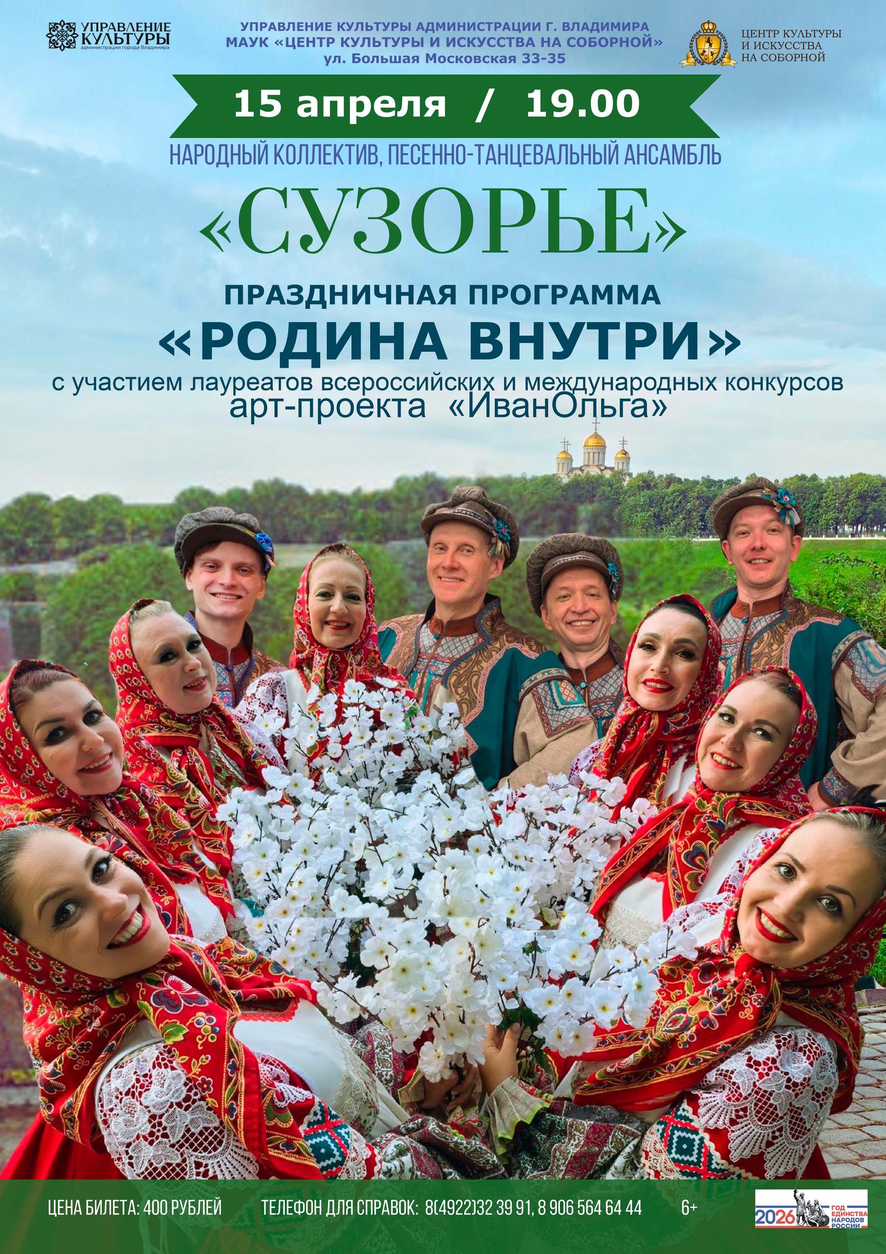 Концерты во Владимире Концерт ансамбля «Сузорье»15 апреля 2026 в 19:00 Весна, которая заставляет сердца биться быстрее… Любимые песни, которые мы знаем и напеваем, потому что они напоминают о самых дорогих моментах жизни. Яркие, захватывающие танцы и эмоциональные сценические номера, от которых невозможно отвести взгляд. Именно таким: ярким, красивым и по-настоящему зрелищным будет концерт ансамбля «Сузорье» «Родина внутри» 15 апреля в 19:00, где на одной сцене встретятся сила традиций и дыхание современности. «Родина внутри» — это не просто концертная программа, а искренний разговор со зрителем о самом сокровенном. О том, что живёт в сердце каждого: о первой любви, о счастье, от которого замирает сердце, о верности, надежде и силе человеческой души. В программе концерта: Любимые хиты нескольких десятилетий в современном звучании Зажигательные танцы Тонкая лирика Яркие сценические постановки В этот вечер вместе с ансамблем «Сузорье» на сцену выйдет вокальный дуэт, арт-проект «ИванОльга» — наши друзья, авторы и аранжировщики некоторых композиций из репертуара ансамбля. Разделите этот вечер с нами. Почувствуйте, как звучит ваша Родина — внутри. Цена билета: 400 руб. Действует Пушкинская карта Билеты: в кассе ЦКИ на Соборной и по ссылке: https://vk.cc/cW040A Дата: 15 апреля 2026 года Начало: в 19.00 Место проведения: Центр культуры и искусства на Соборной Адрес: г. Владимир, ул. Большая Московская, 33/35 Информация с https://vk.ru/wall-45749277_3308 « вернуться владимирская афиша другие концерты во Владимире |