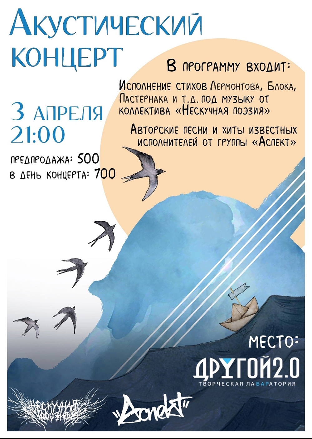 Концерты во Владимире Акустический концерт "ПОЭЗИЯ & РОК"03 апреля 2026 в 21:00 В программе вечера: • Исполнение стихов Лермонтова, Блока, Пастернака и т.д. под музыку от коллектива «Нескучная поэзия» • Авторские песни и хиты известных исполнителей от группы «Аспект» Вход: 700 руб. Бронь стола: https:/drugoy-bar.restoplace.ws/ Дата: 03 апреля 2026 Начало: в 21.00 Место проведения: Другой Бар 2.0 Адрес: Владимир, ул. Студёная гора, 36А Информация с https://vk.ru/wall-136740493_5878 « вернуться владимирская афиша другие концерты во Владимире |